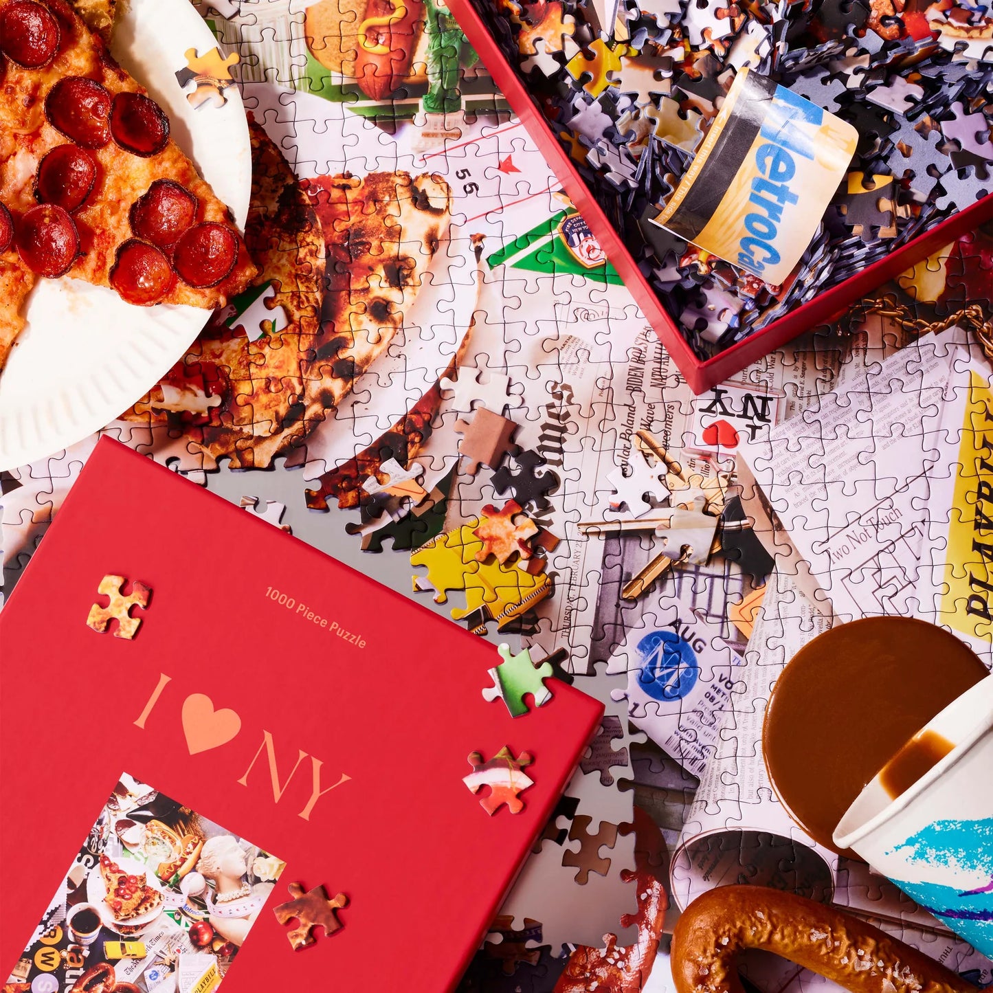 Pizza, pretzels, playbills and deli coffee — this is New York, the Big Apple, the city that never sleeps, the Empire State, captured in one 1000 piece puzzle.