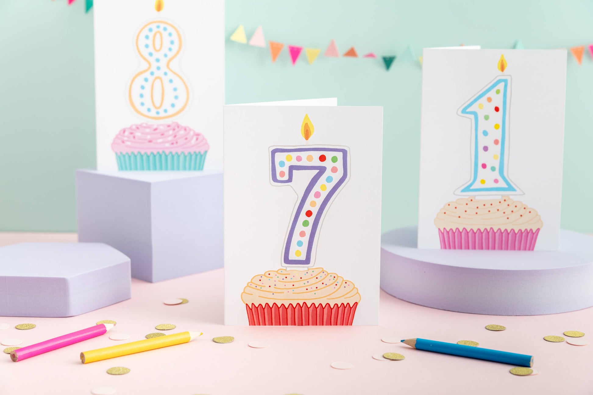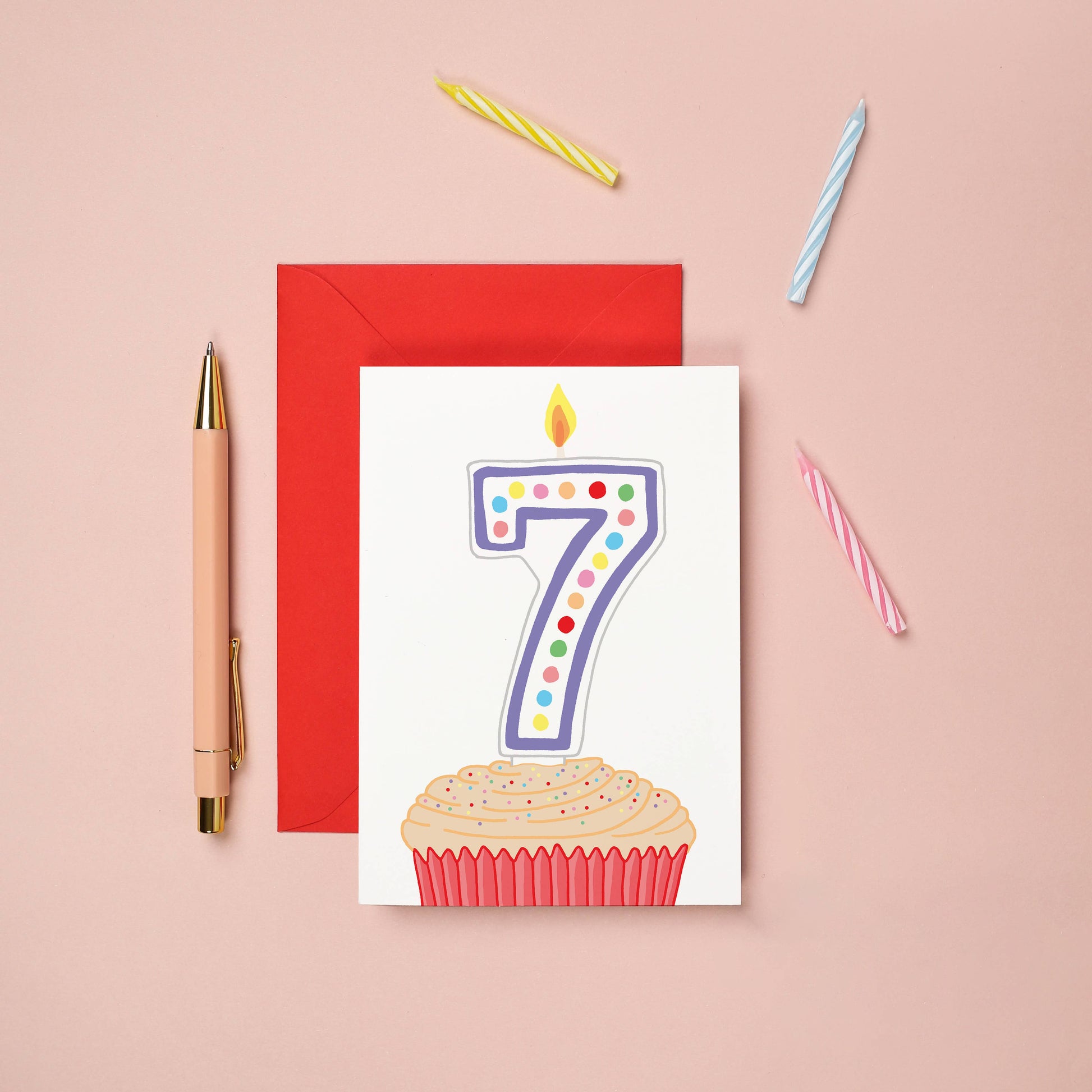 Celebrate good times with this milestone birthday card for a smashing seven-year-old! The gender-neutral design features a hand-drawn cupcake with swirled icing, topped off with a bold candle shaped like the number 7. Perfect for sending heartfelt birthday wishes, this card is blank inside a personal message.