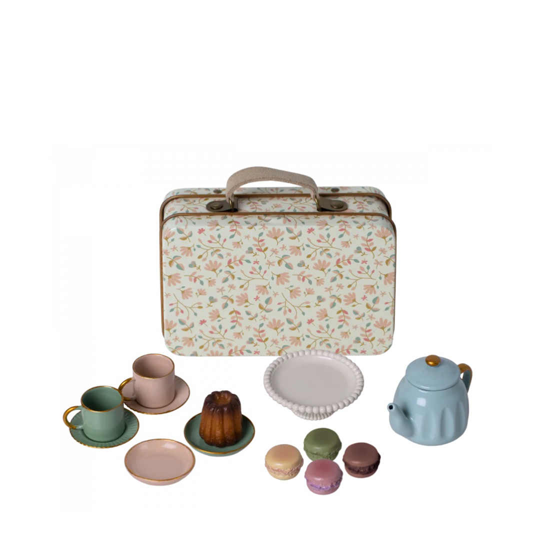 This tea set is the perfect size for a mouse paw. Each set includes all you need for a cozy moment with tea, cakes and tableware. It comes in a metal suitcase, lovely decorated with Maileg print.
