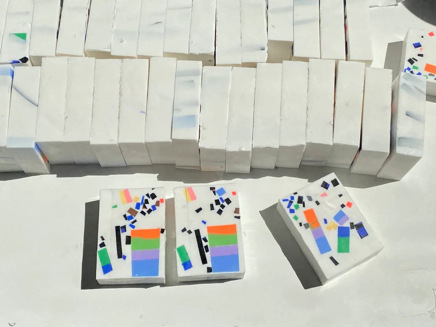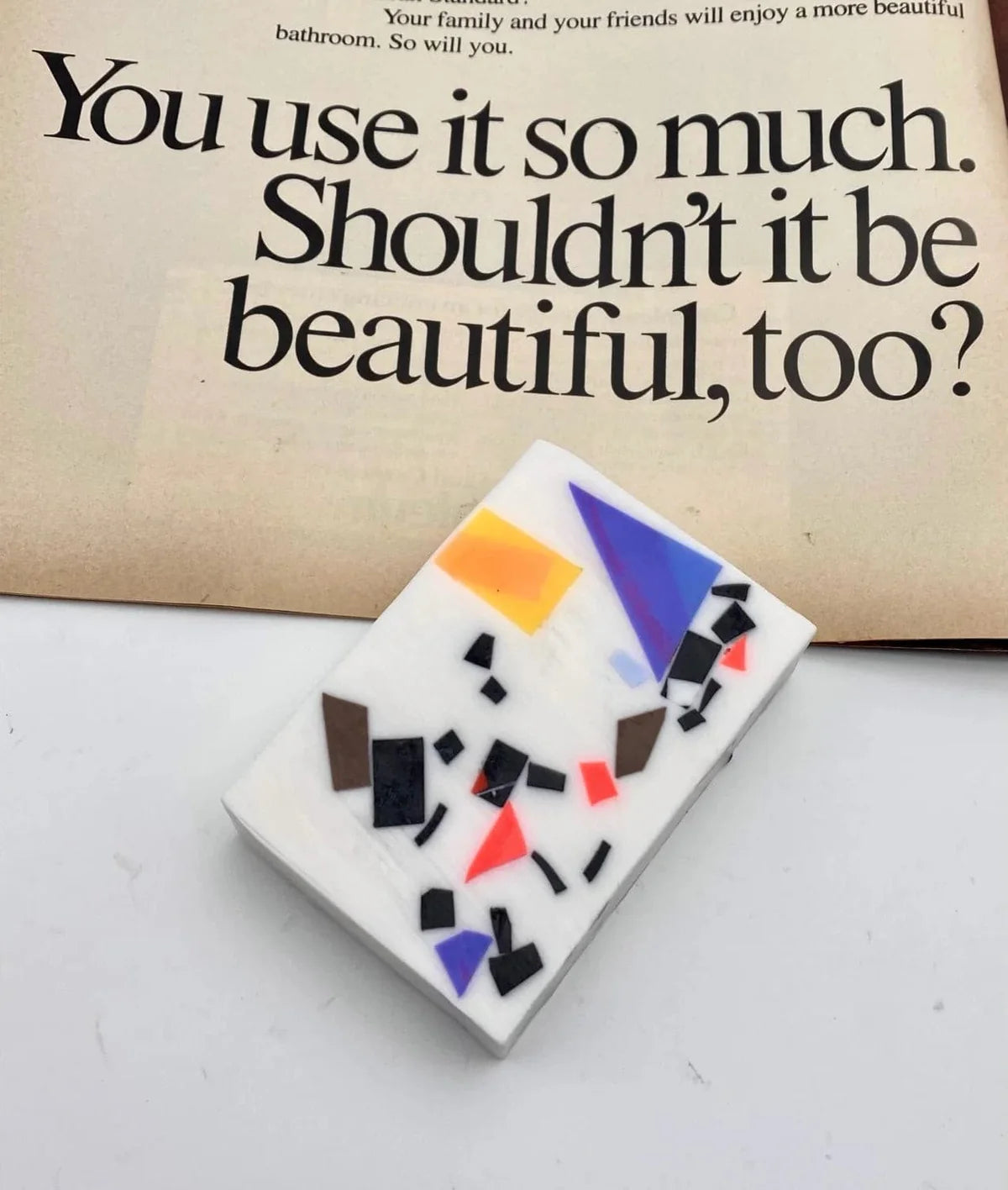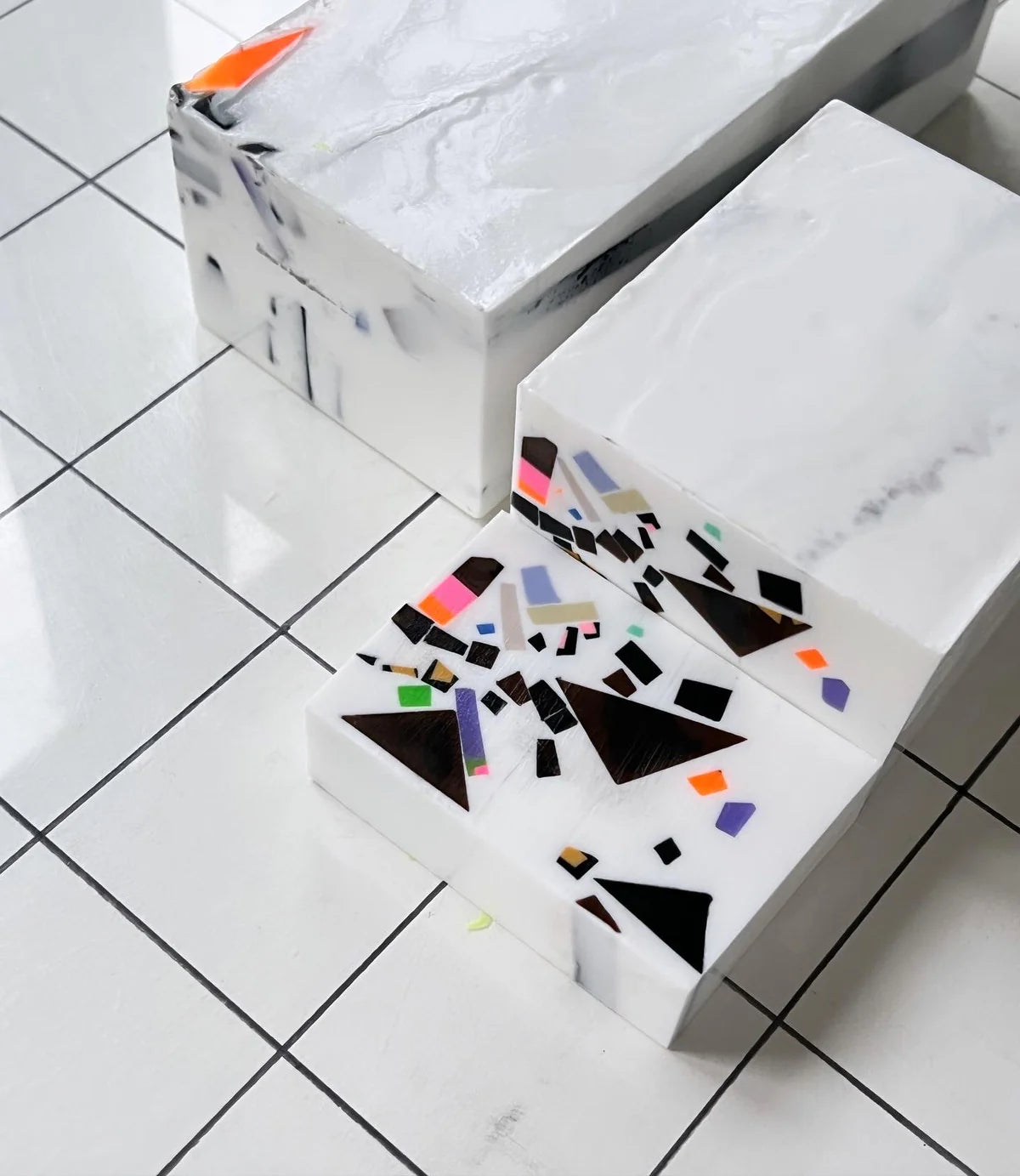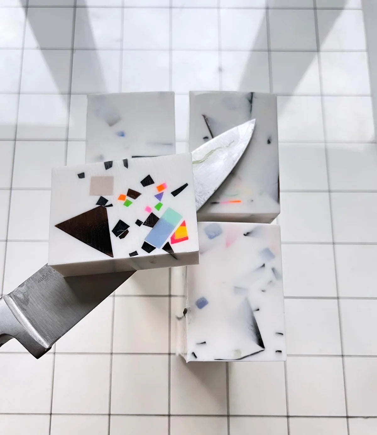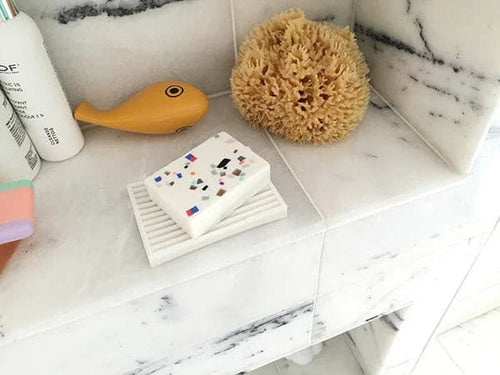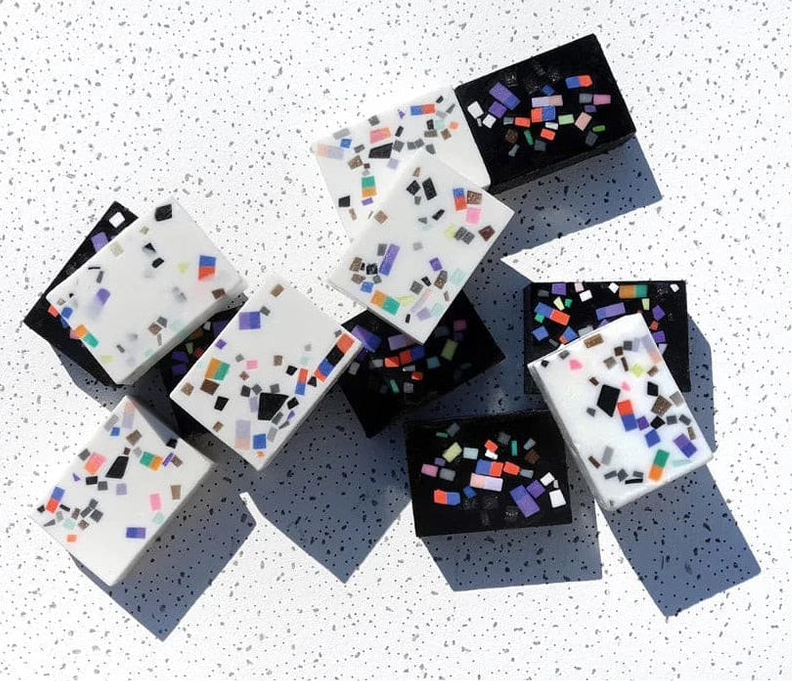 “These inlaid soaps first came about as a studio experiment with end-of-day scrap pieces of soap which we embedded into white soap and sliced smooth. We then refined the look as they came to resemble the late Japanese designer Shiro Kuramata’s embedded concrete and terrazzo work.”