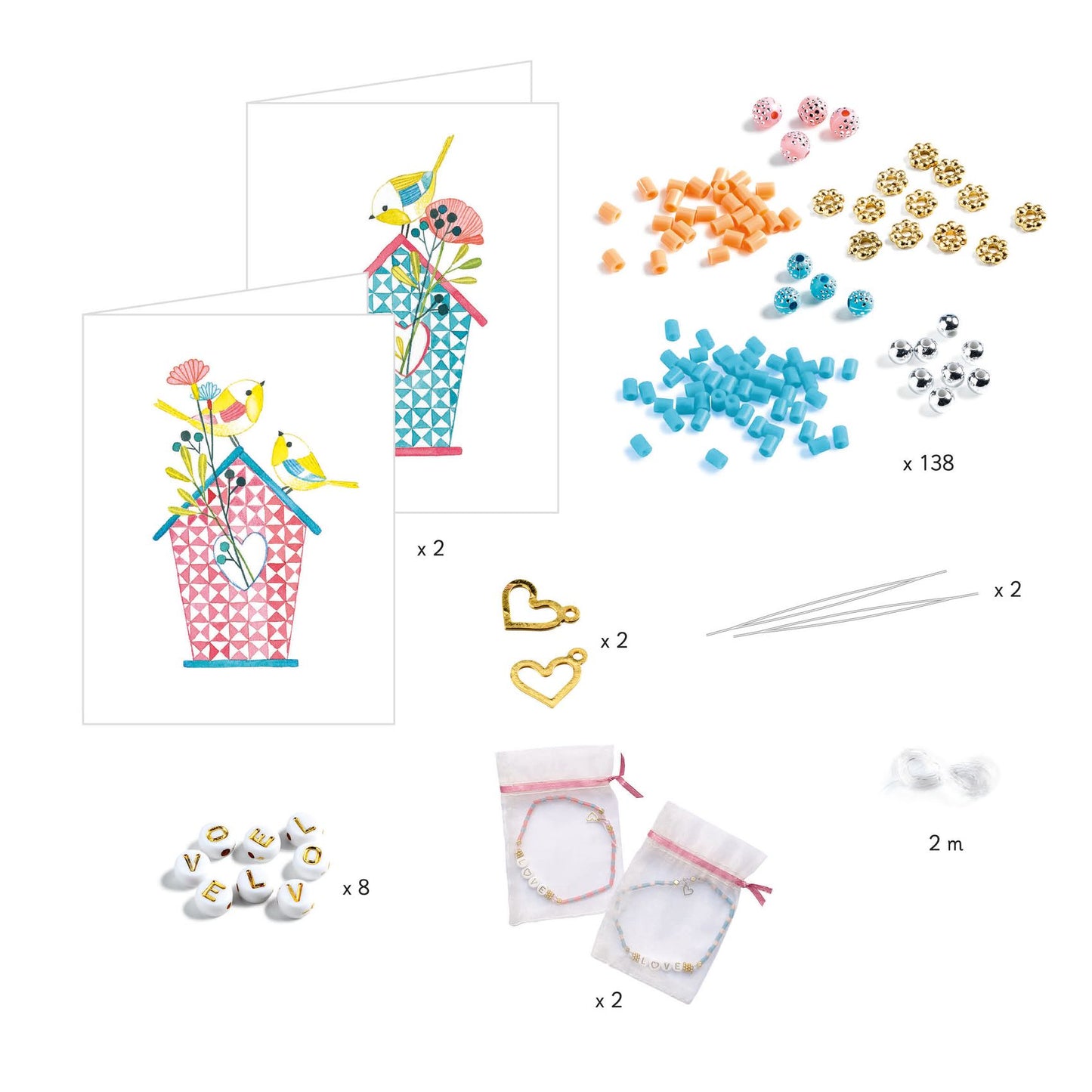 Contents: 350 beads, 2 charms, 2m of elastic thread, 2 needles, 1 instruction booklet, 2 organza bags, 2 illustrated cards.