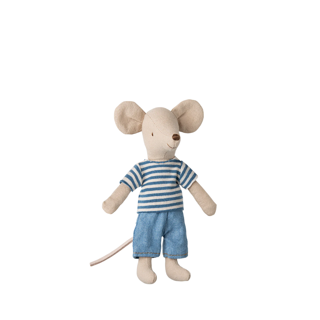 This mouse is called LouiMax and he is a really adventurous guy. He wears a blue striped shirt and a pair of denim pants. The mouse has magnets in his hands and is sold in a decoration box. The mouse is size big brother.