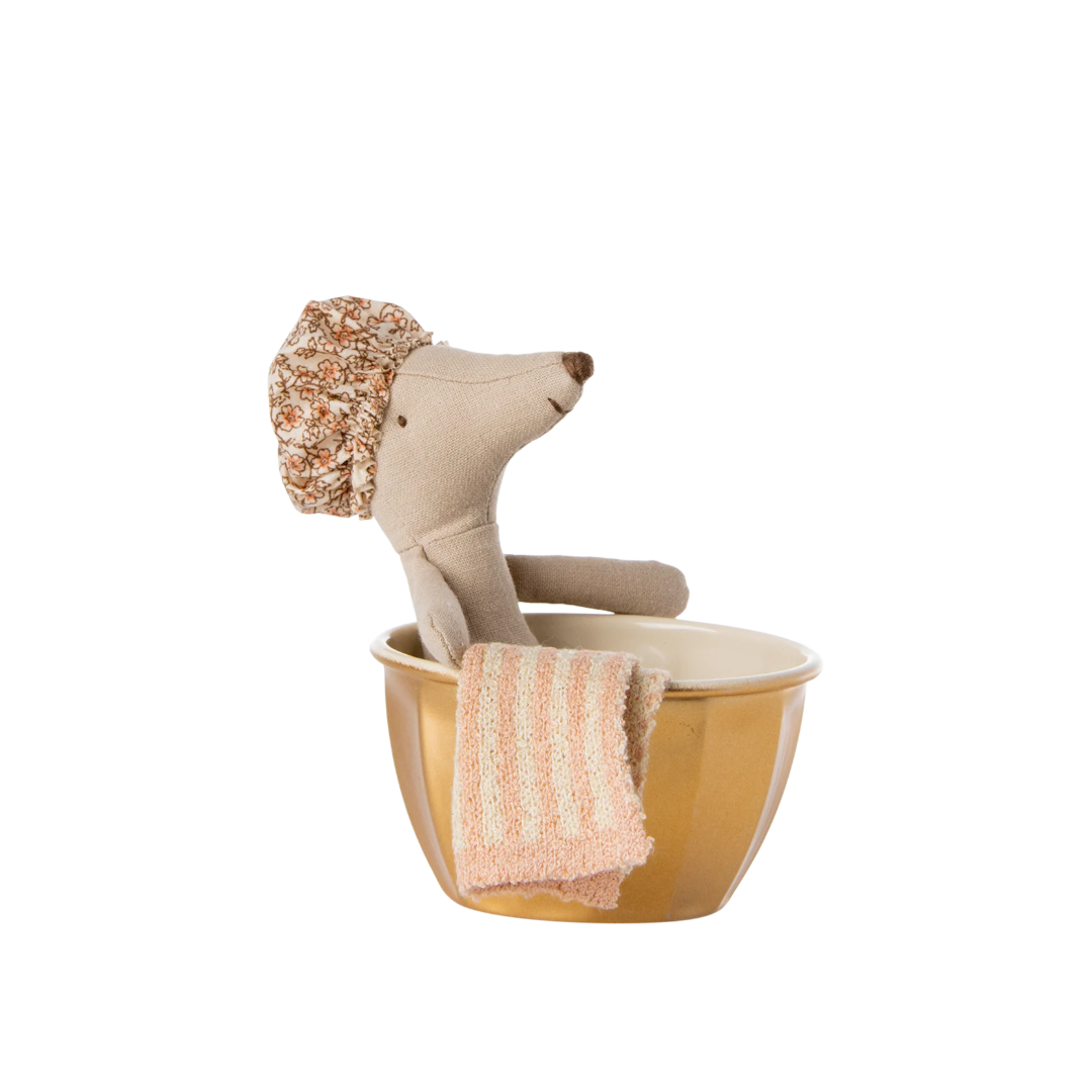 Like everyone else, this mouse loves to spend hours in the warm water in her lovely bathtub. This playset contains a golden metal bathtub, a big sister mouse, a shower cap, and a towel.