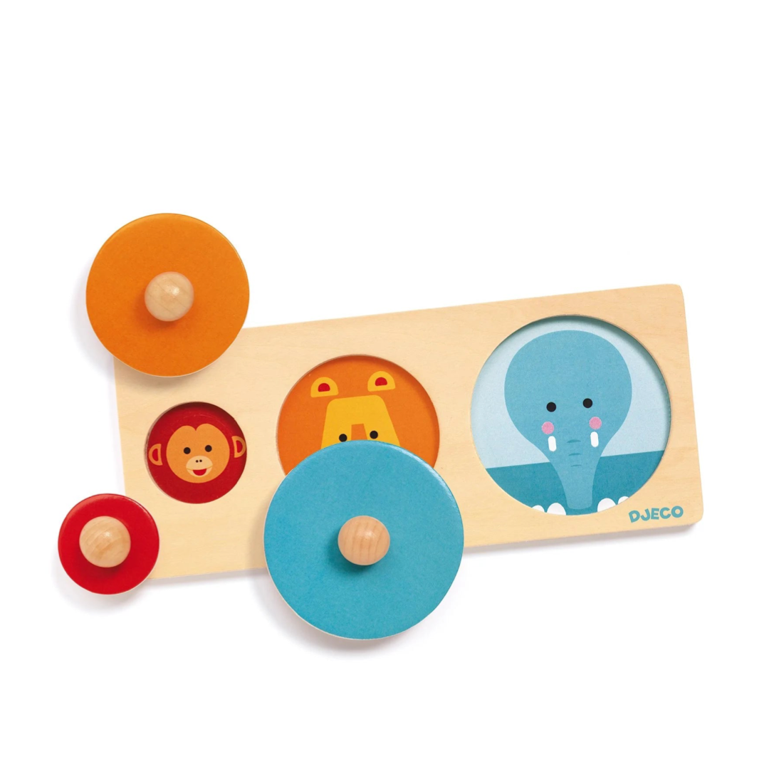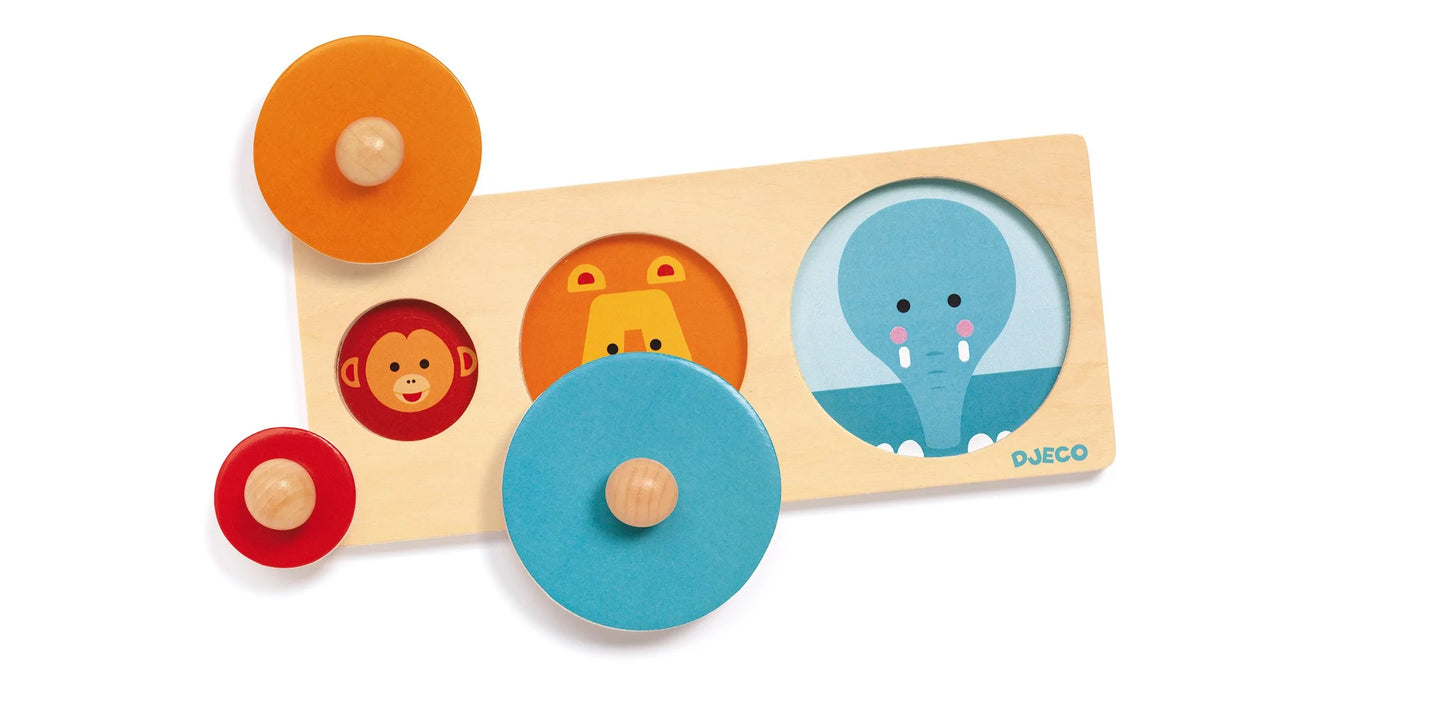 - Pull the knobbed pieces out to reveal the friendly monkey, elephant and lion underneath