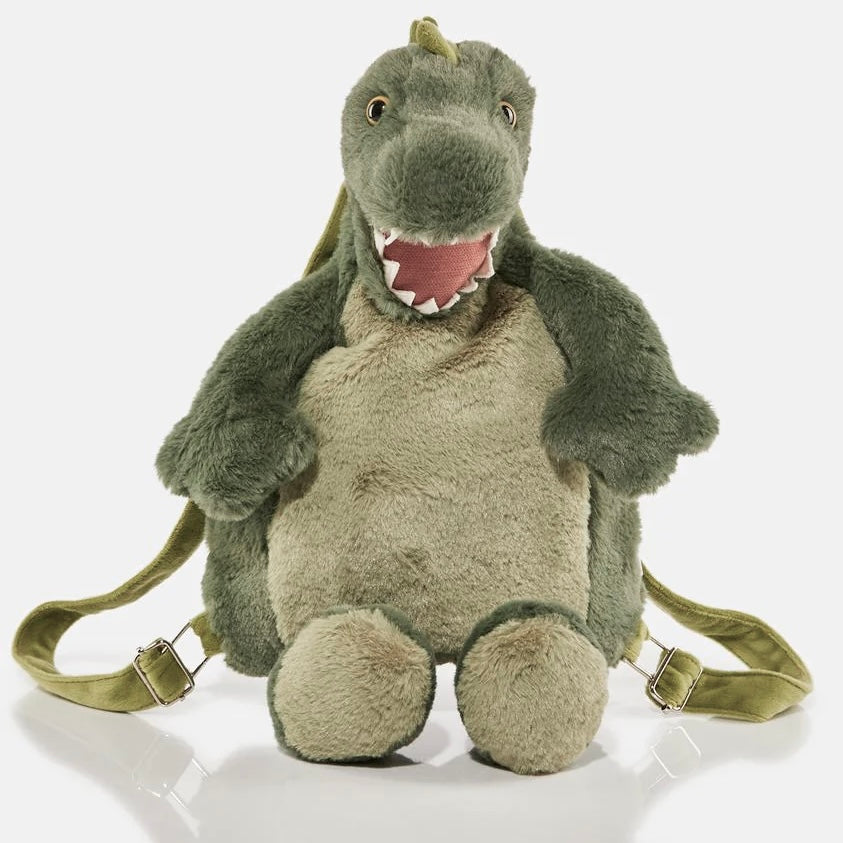 MON AMI friends turned into plush backpacks! Bruno T-Rex has adjustable straps and zipper storage compartment. These plush backpacks are not only cuddly and cute, they are functional. Perfect for storing little treasures.