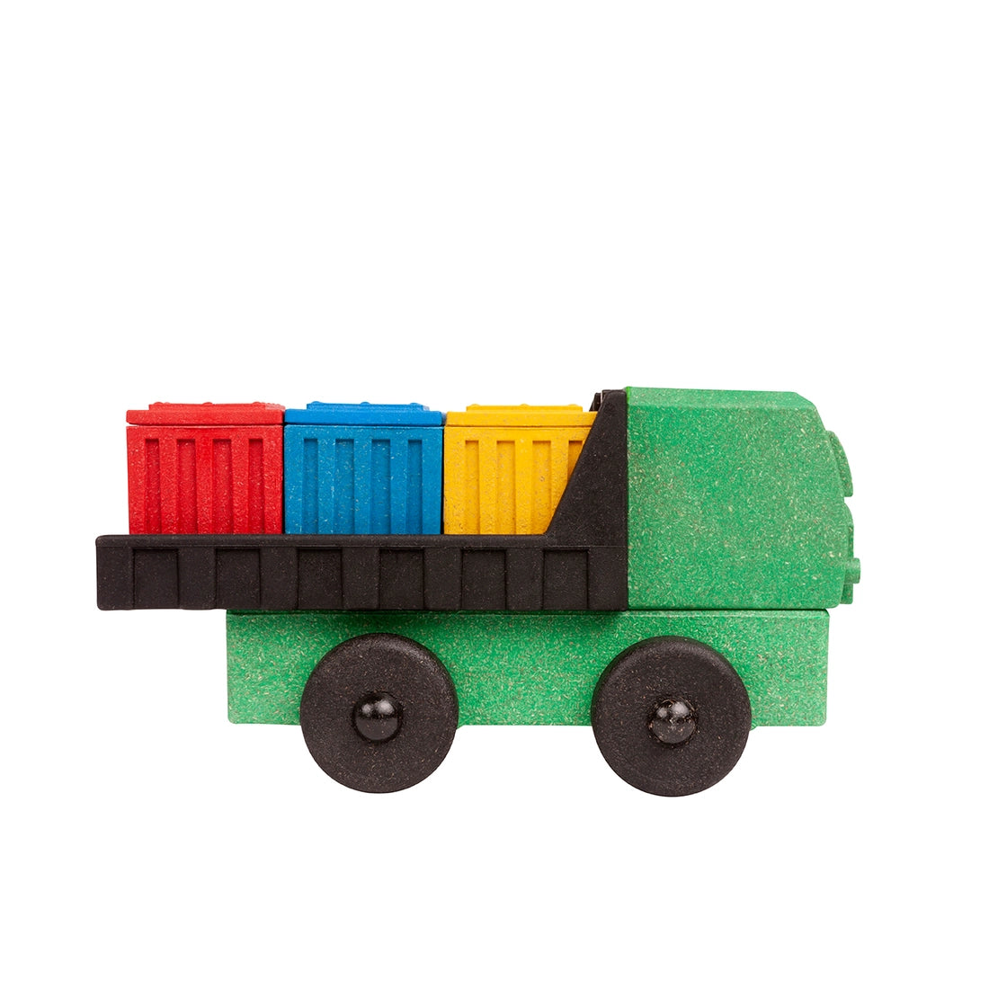 This cargo truck is a nine-part puzzle (with all those boxes) that rewards your child with a working cargo truck. The boxes have lids that come off so you can stash treasure inside. They also stack on top of each other so they can be stacked up and knocked down.