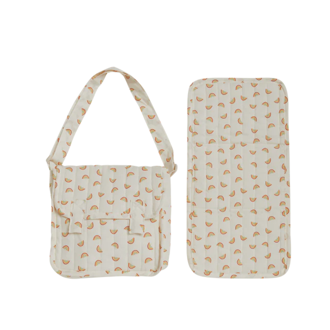 Calling all mini parents! Meet the Carrie Convertible Changing Bag – Rainbow Print, the ultimate doll nappy bag for imaginative play and on-the-go adventures. Perfectly sized for Dinkum Dolls, teddies, and other toys, this versatile bag can be used as a backpack, shoulder bag, or crossbody bag and easily attaches to any Olli Ella strolley or pram.