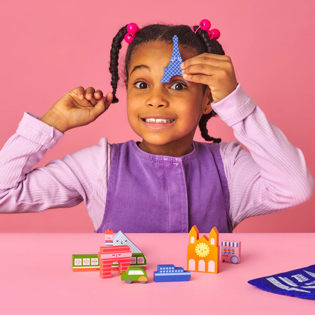 Adorable mini wooden city with iconic buildings and landmarks. 9 pieces with a cotton bag. Portable and convenient, these eco-friendly mini wooden blocks can provide hours of creative and educational play for both children and adults while promoting cultural awareness and fine motor skills.