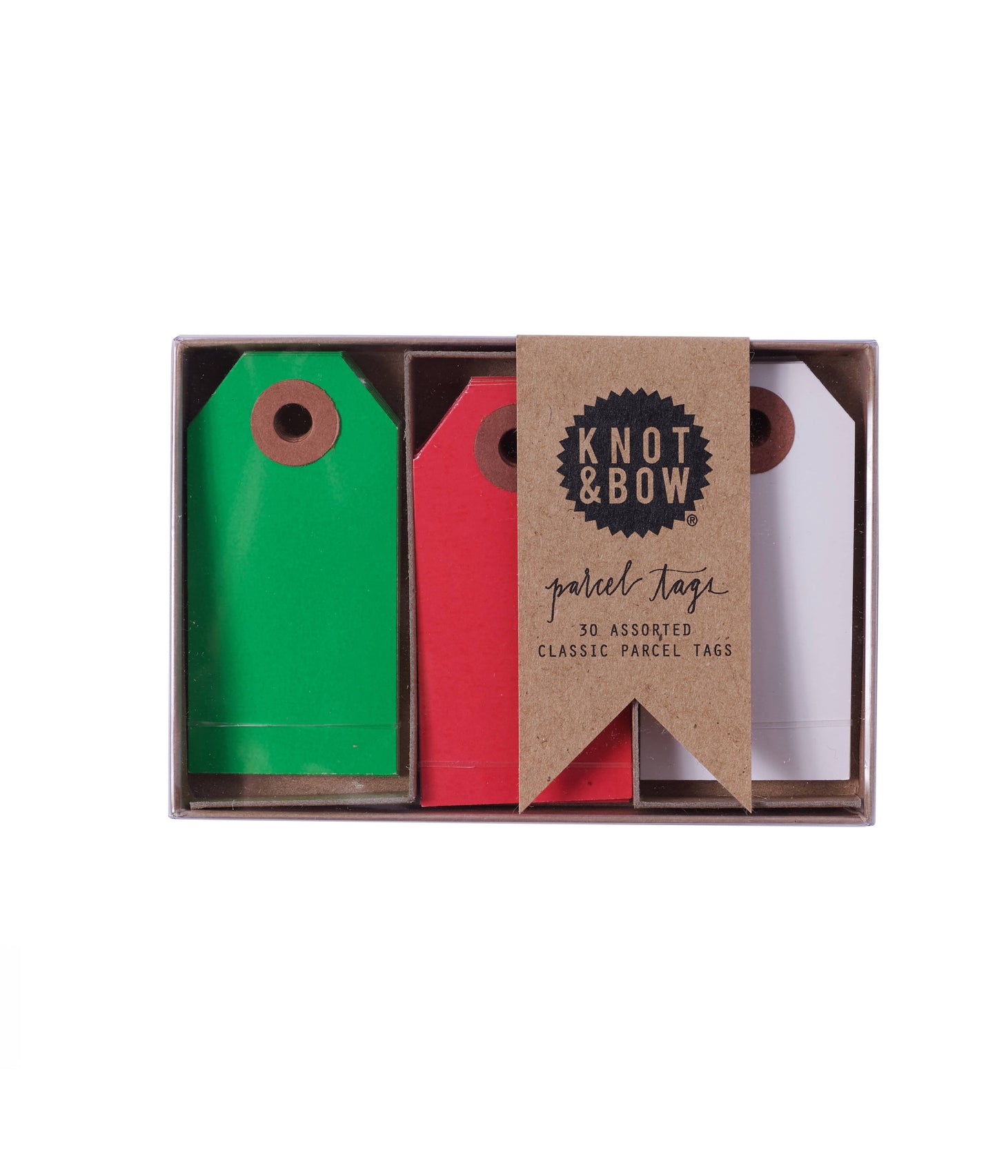 Details: 30 Parcel Tags, 1 3/8" x 2 3/4" tags, 10 of each color, Made in the USA and assembled with love in Brooklyn.