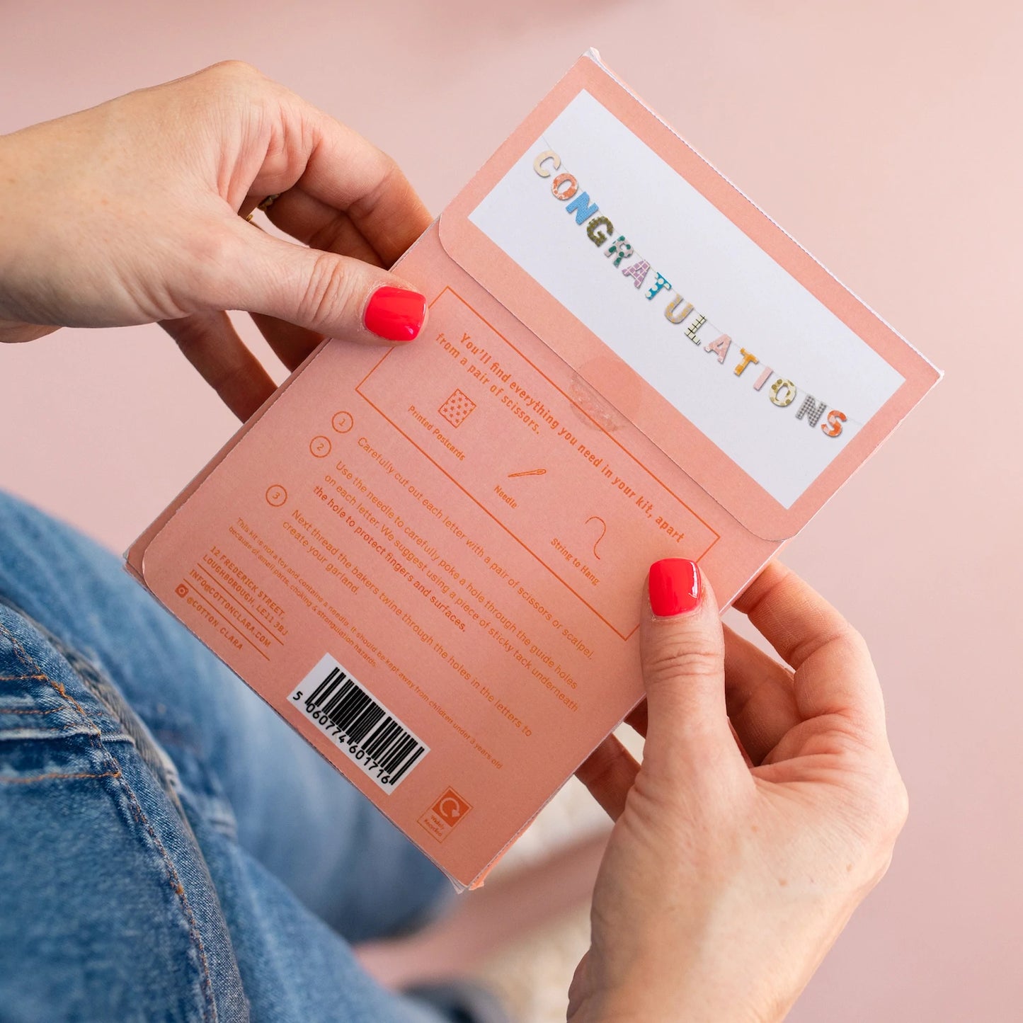 Each pack contains a set of printed postcards that spells out 'Congratulations' once cut, gold white striped bakers twine for hanging, and a sharp needle.