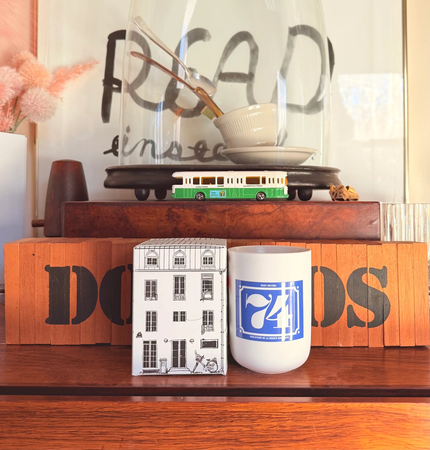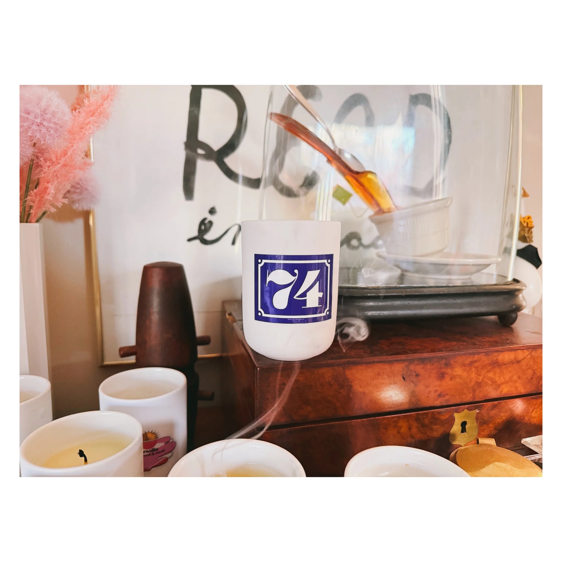 From Wary Meyers: This has actually been in the works since we started making candles- to have a candle that featured just a blue enamel French number- it’s such a striking graphic. So, included in the box is a French number sticker, either 70 or 74, for you do stick on the other side of the jar. By the way Bougie Parfumée is French for Scented Candle.