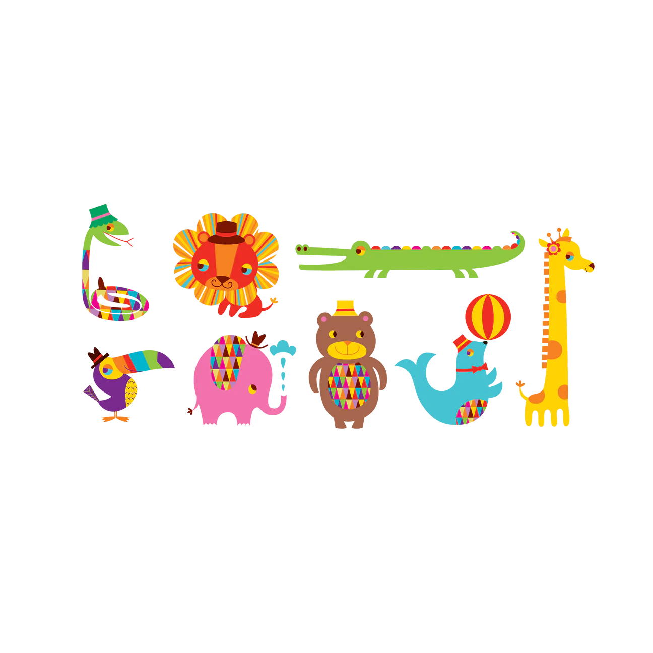 The Menagerie Set includes the following designs by Amy Blay: Sassy Snake, Lovely Lion, Cordial Crocodile, Genial Giraffe, Tactful Toucan, Eloquent Elephant, Benevolent Bear, and Sophisticated Seal.