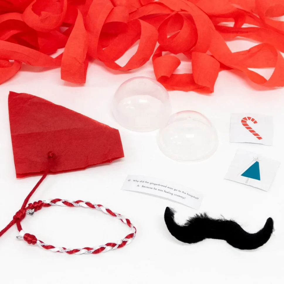 If you want to give your family and friends a fun surprise treat, then pop these fabulous balls at your place settings. They are crafted with traditional red and silver festive colors, and unwrap to reveal a paper hat, joke, self-adhesive mustache, 2 stickers, and a friendship bracelet. They are excellent to use as stocking fillers or as party bag treats too.