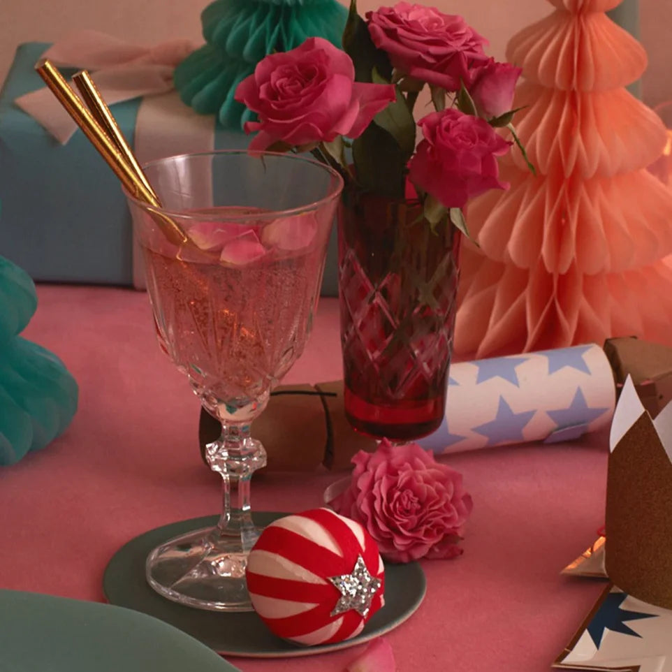 - Covered with red and white crepe paper, and topped with plant based Eco silver glitter star stickers