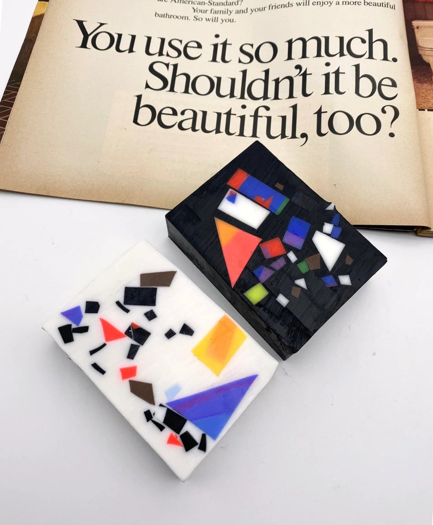 “These inlaid soaps first came about as a studio experiment with end-of-day scrap pieces of soap which we embedded into white soap and sliced smooth. We then refined the look as they came to resemble the late Japanese designer Shiro Kuramata’s embedded concrete and terrazzo work.”
