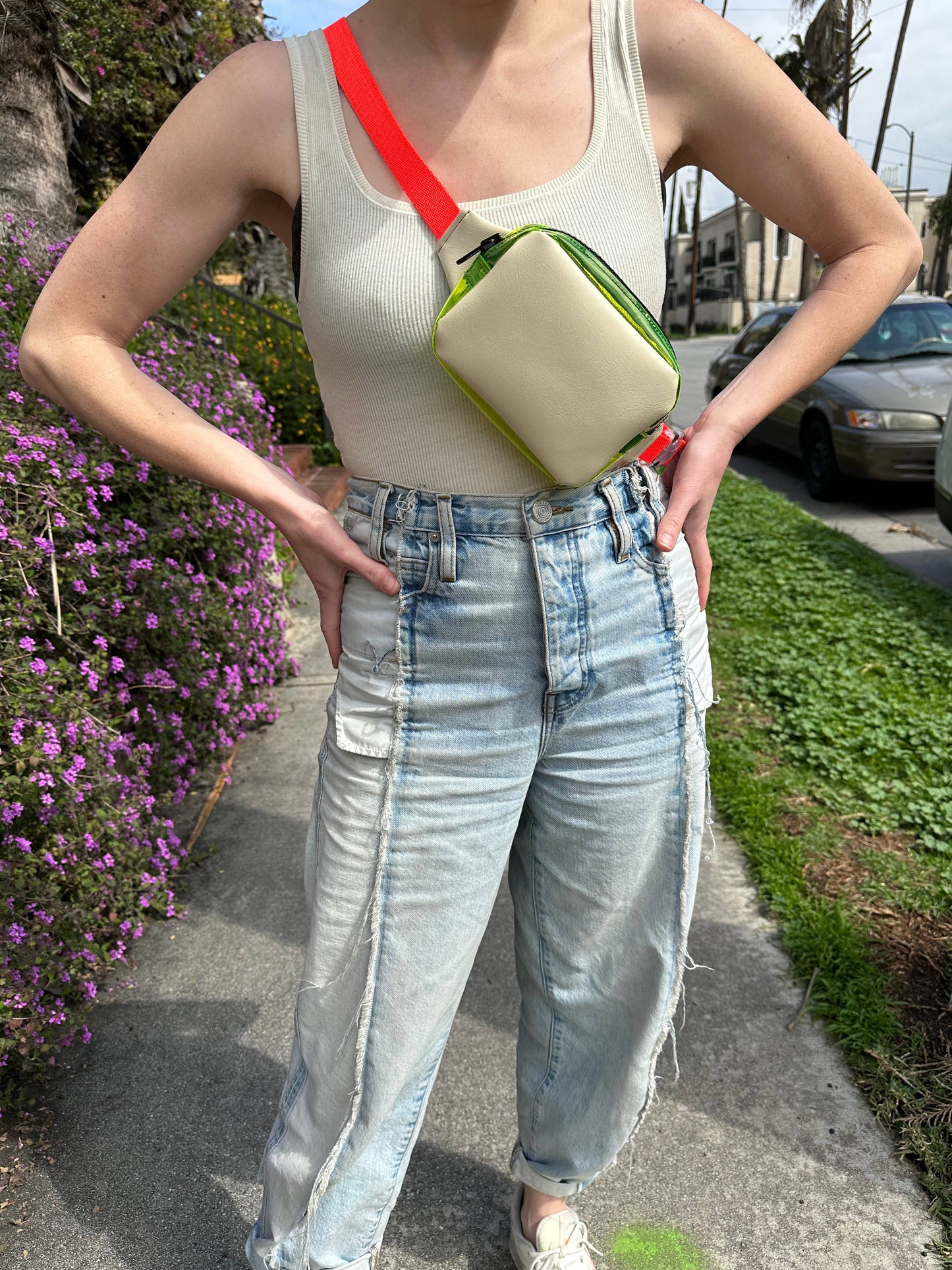Around your waist or around your body -- this fanny pack is perfectly sized to hold all your essentials on the go! Cream vegan leather and yellow transparent vinyl with a neon orange 1" wide adjustable strap will have everyone asking you, "Where the f*** did you get that fanny pack?!" Completed with black and clear plastic hardware!