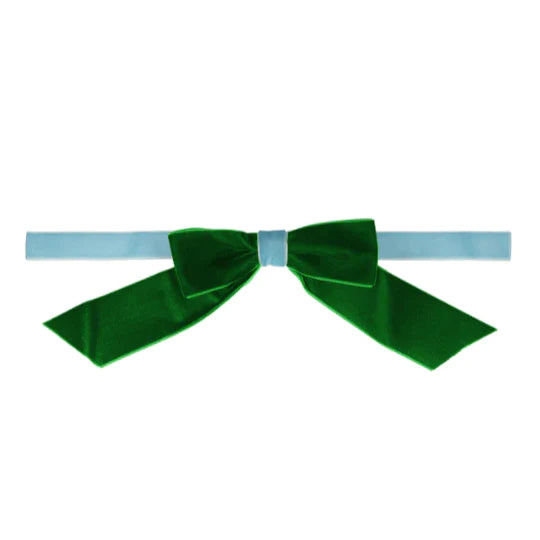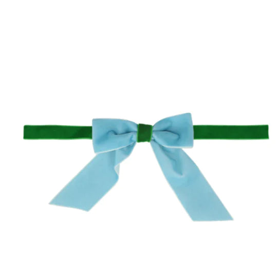 - Velvet bows with co-ordinating velvet ribbon centers and ties - dusty pink with red, green with dusty blue; red with dusty pink, and dusty blue with green.