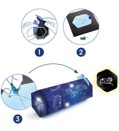 A creative kit to make a constellation viewer. Punch the stars on the cards to recreate the patterns of the 26 selected constellations (Zodiac signs and animals), and watch their image form through the previously assembled viewer. It’s so magical to watch the hidden constellation illustration appear! A booklet is included to help you place the constellation in the starry sky. Perfect for getting children interested in stargazing and the beauty of the night sky.