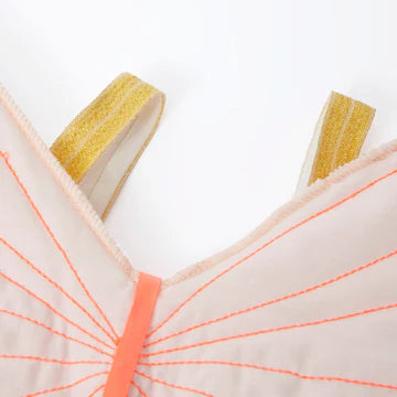 No dress-up box is complete without a set of wings, and these are sure to delight any little fairy! Made from beautiful peach cotton and featuring elegant stitched details. These wings are attached with gold elastic arm straps, making them perfect for any adventure. As a finishing touch, this dress-up set also comes with a brilliant flower headband and a drawstring storage bag.