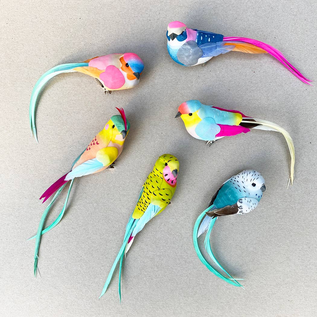 Colorful feather bird clips designed by Petra Boase. The delicate birds have polystyrene bodies, painted feathers and a sturdy metal clip. They are all hand painted so there will be natural imperfections.