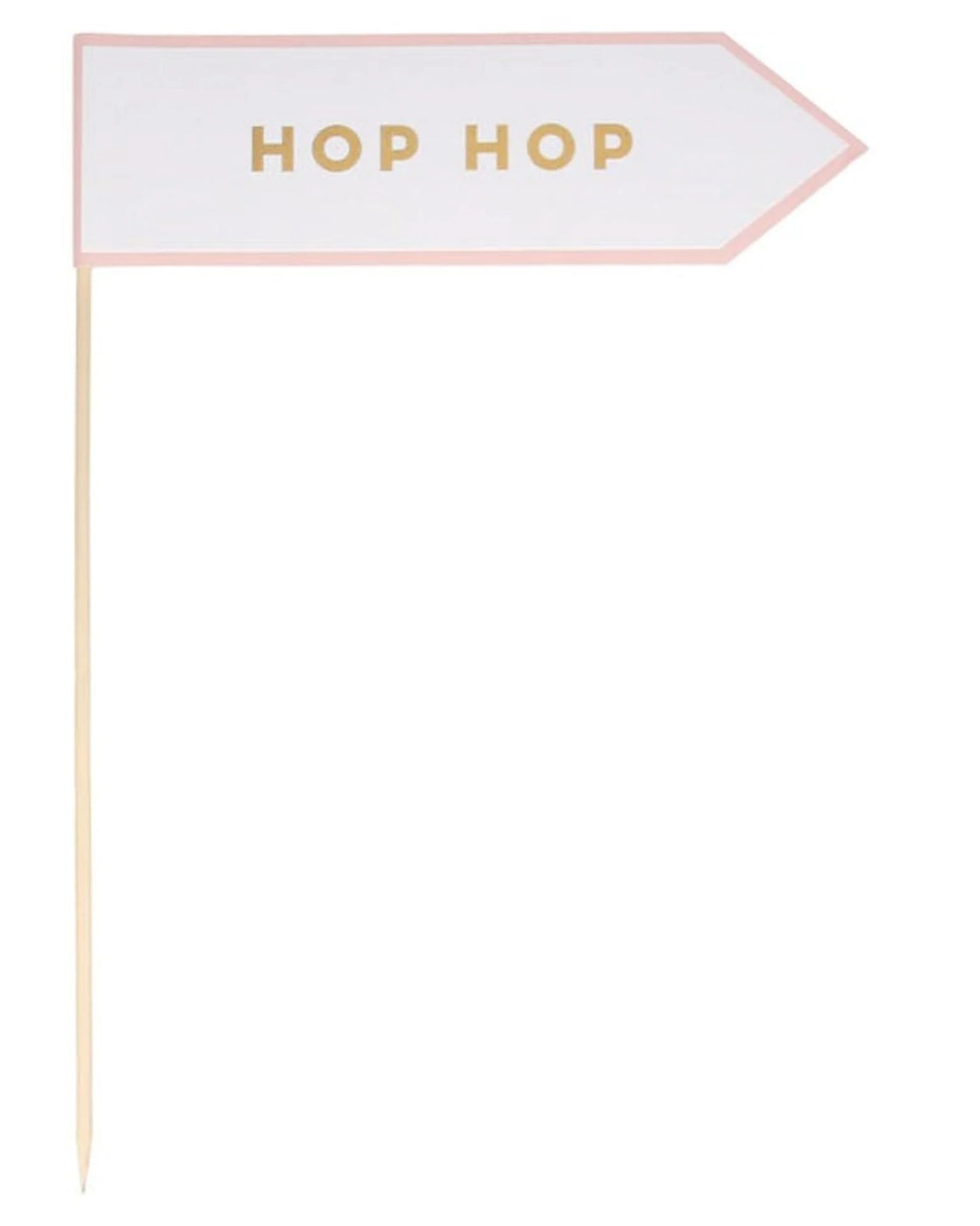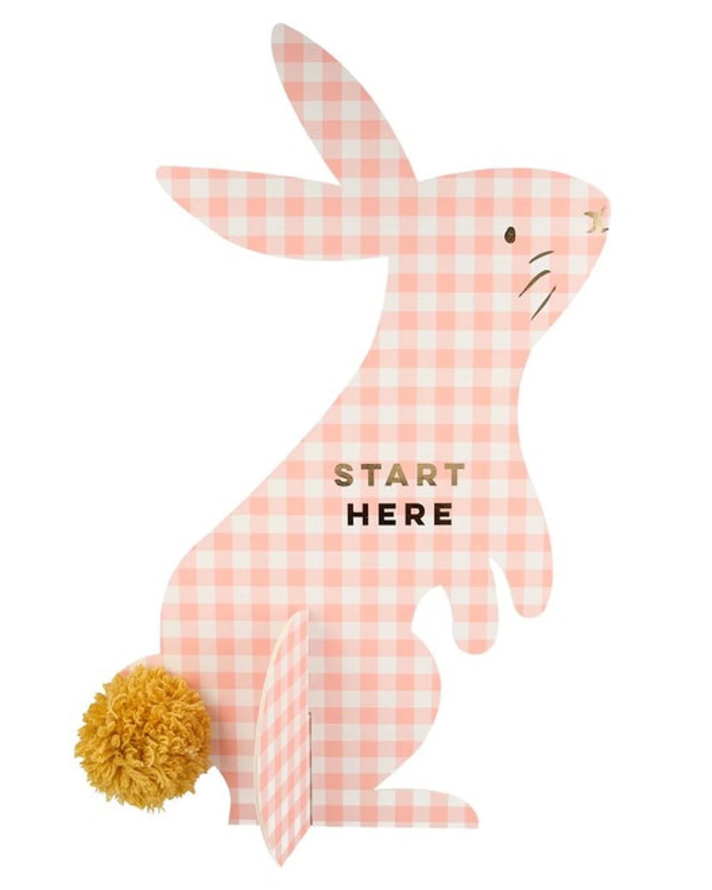 - Gold foil clues are printed on the bunnies, like “This way” and “Over here”