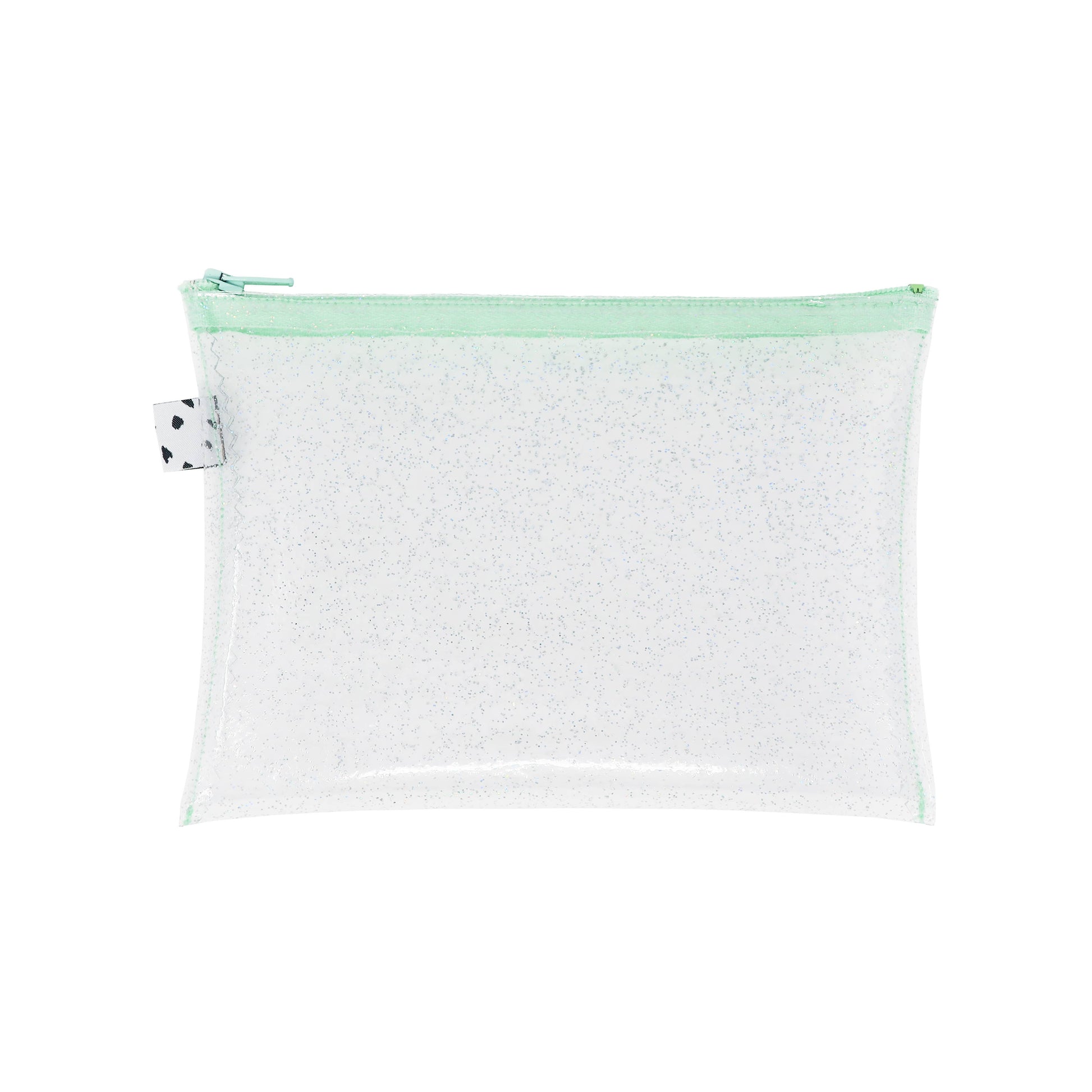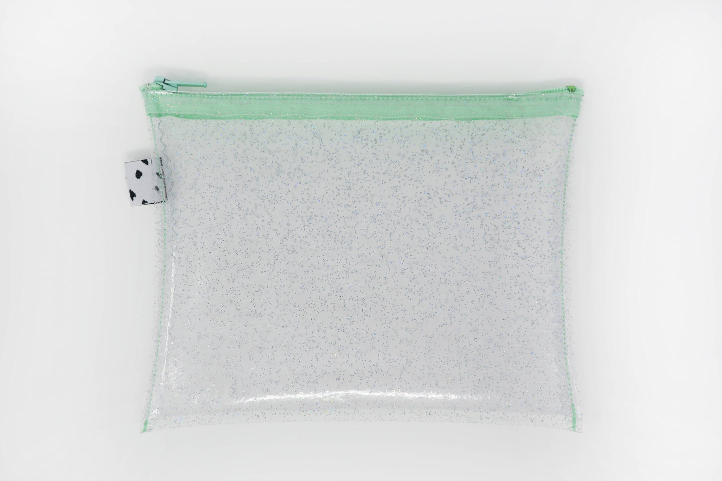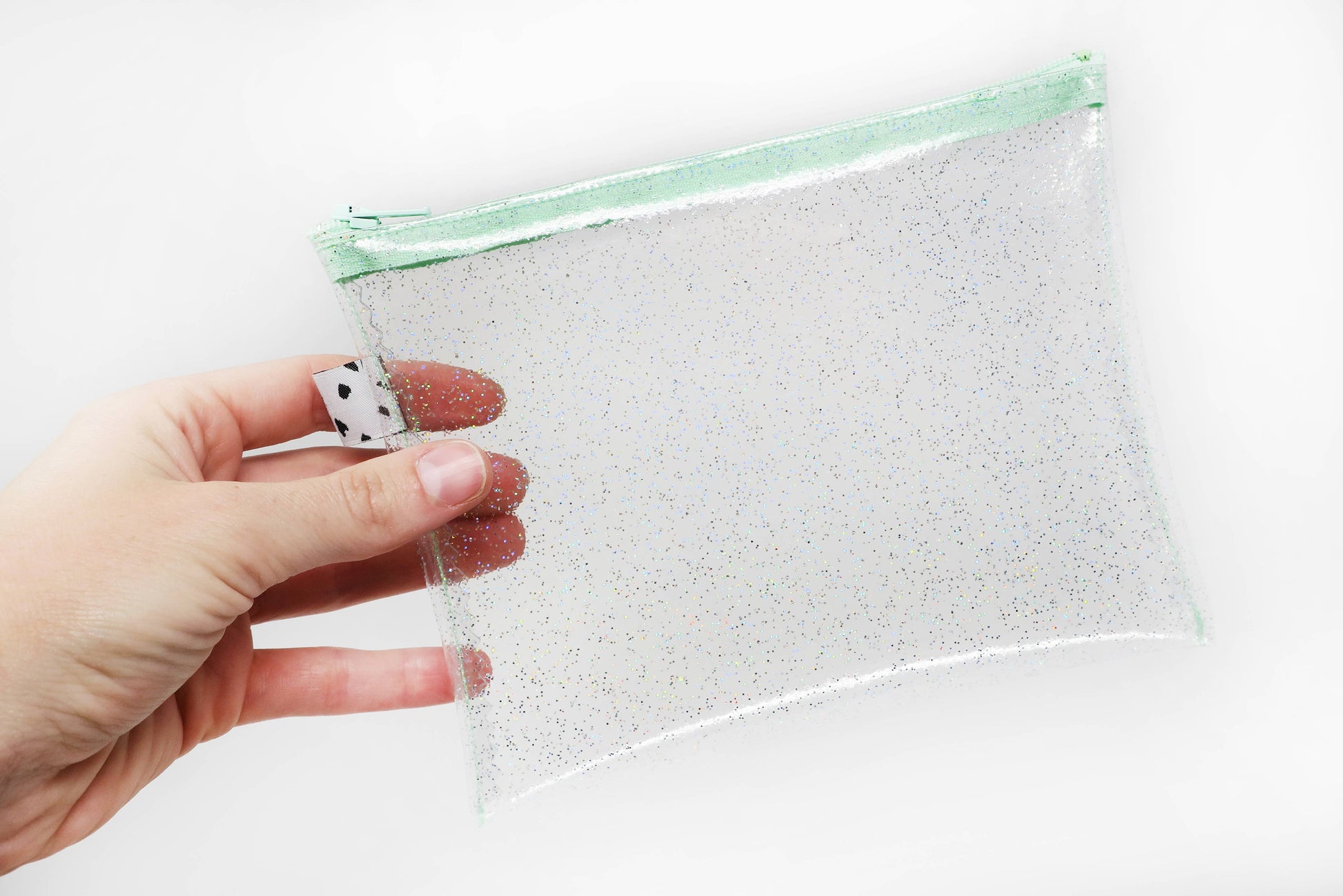 What can't fit in our wallets, can fit in this pouch. Keys, chapstick, good luck tchotchkes — what have you! This chic one color version is made with glitter vinyl and a fresh mint colored zipper. Perfect for travel! Keep it all organized and compact.