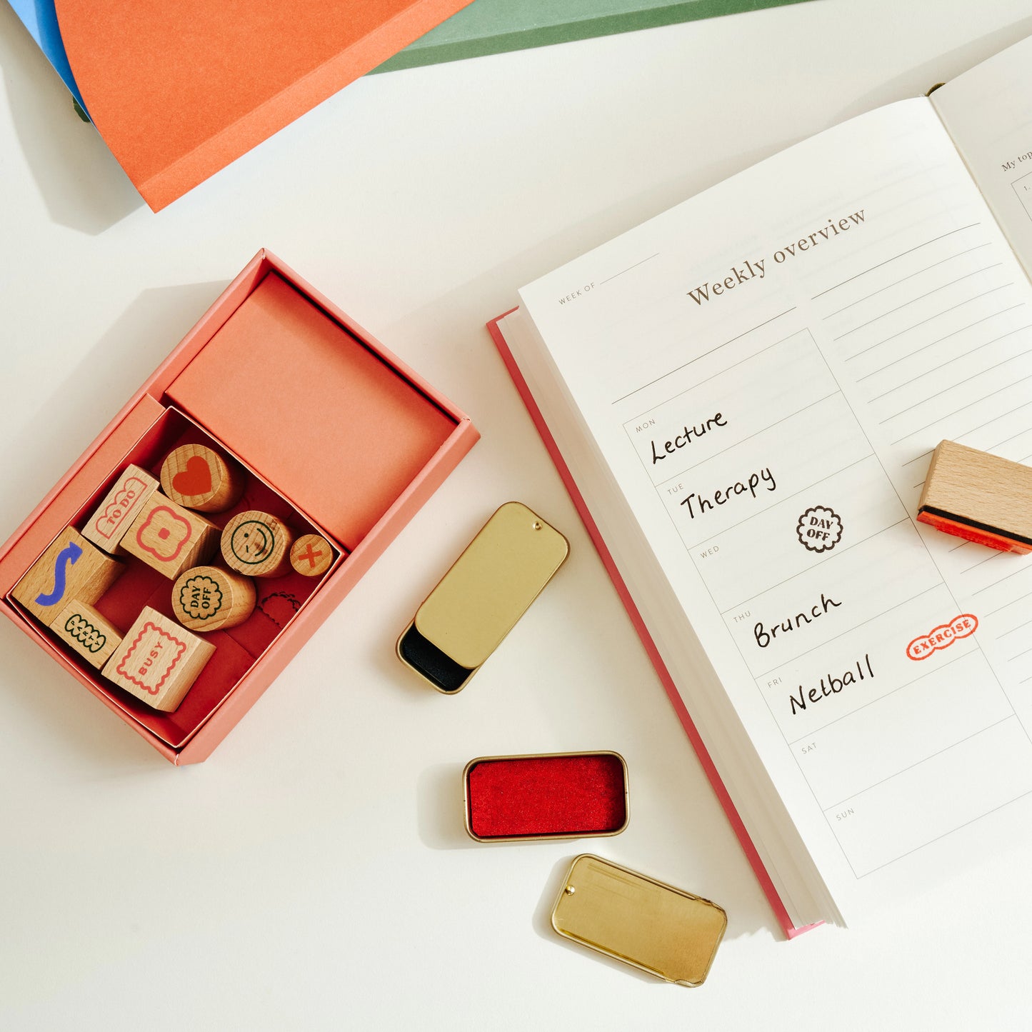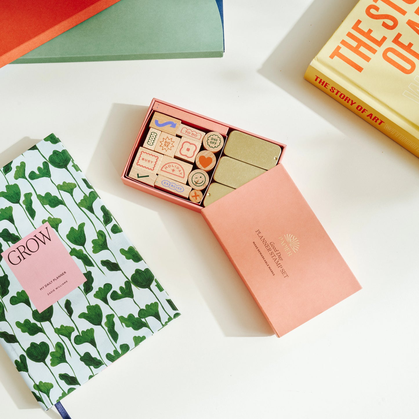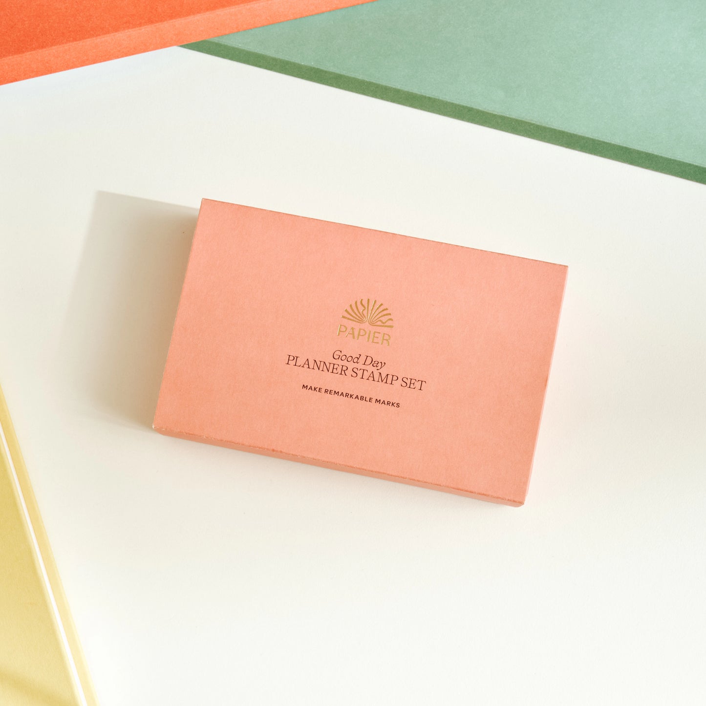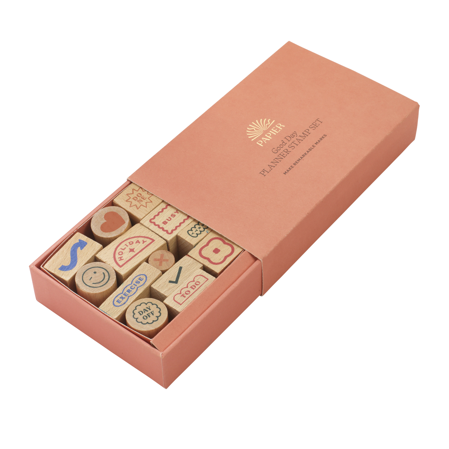 Stamp your style on your stationery. Our Good Day stamp set lets you personalize and plan your pages. The set comes with a mix of organizational stamps to mark days off, important dates and more, plus fun shapes to brighten your page. With 13 stamps in 3 inks (red, blue and black), this set is the perfect partner for planners.