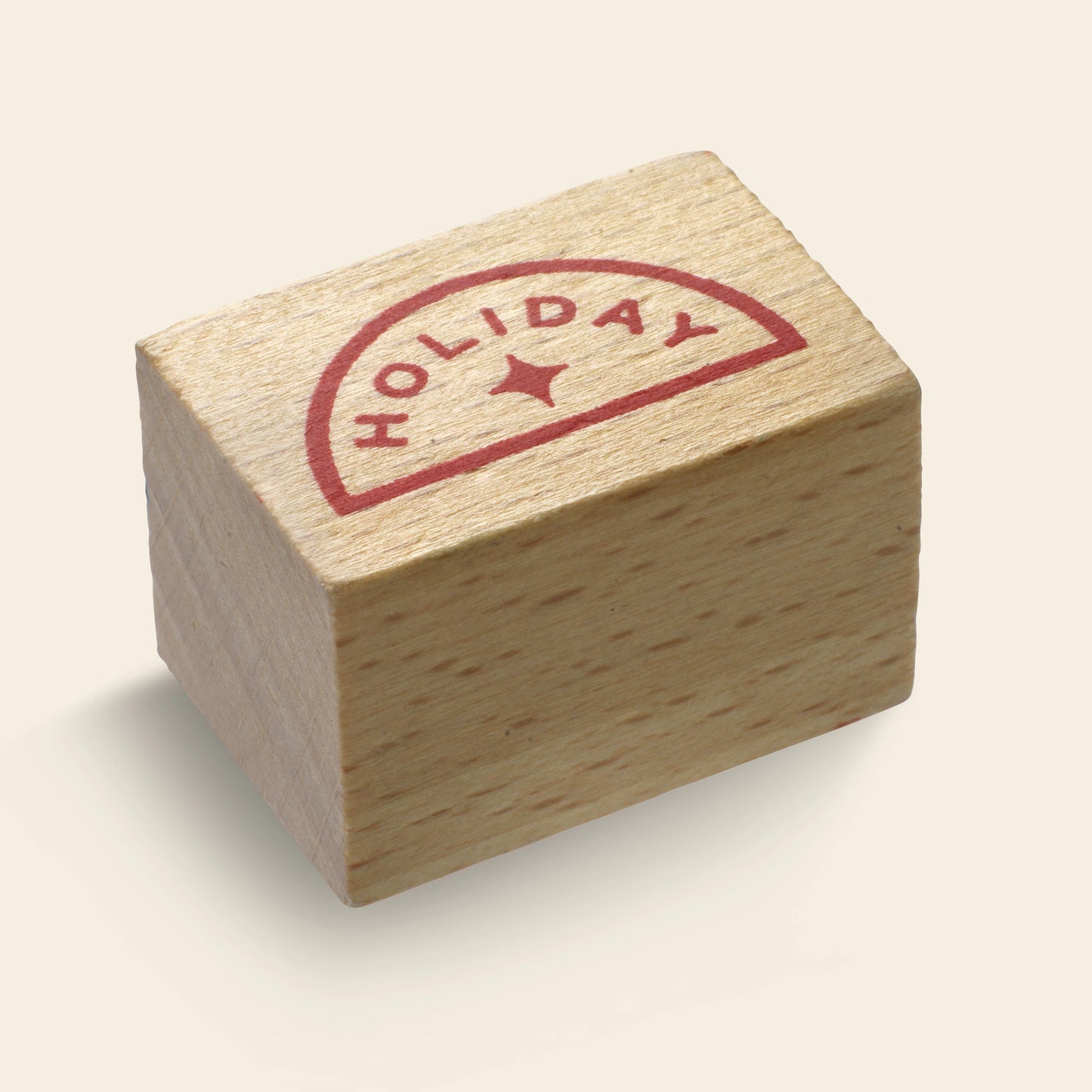 13 beech wood and rubber stamps with a tin ink holder, stored in a paper sleeve.