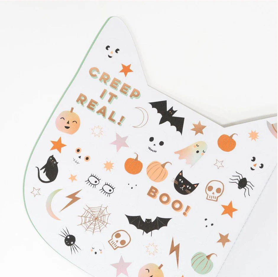 - There are 6 pages of stickers, including Halloween icons and shiny silver letters