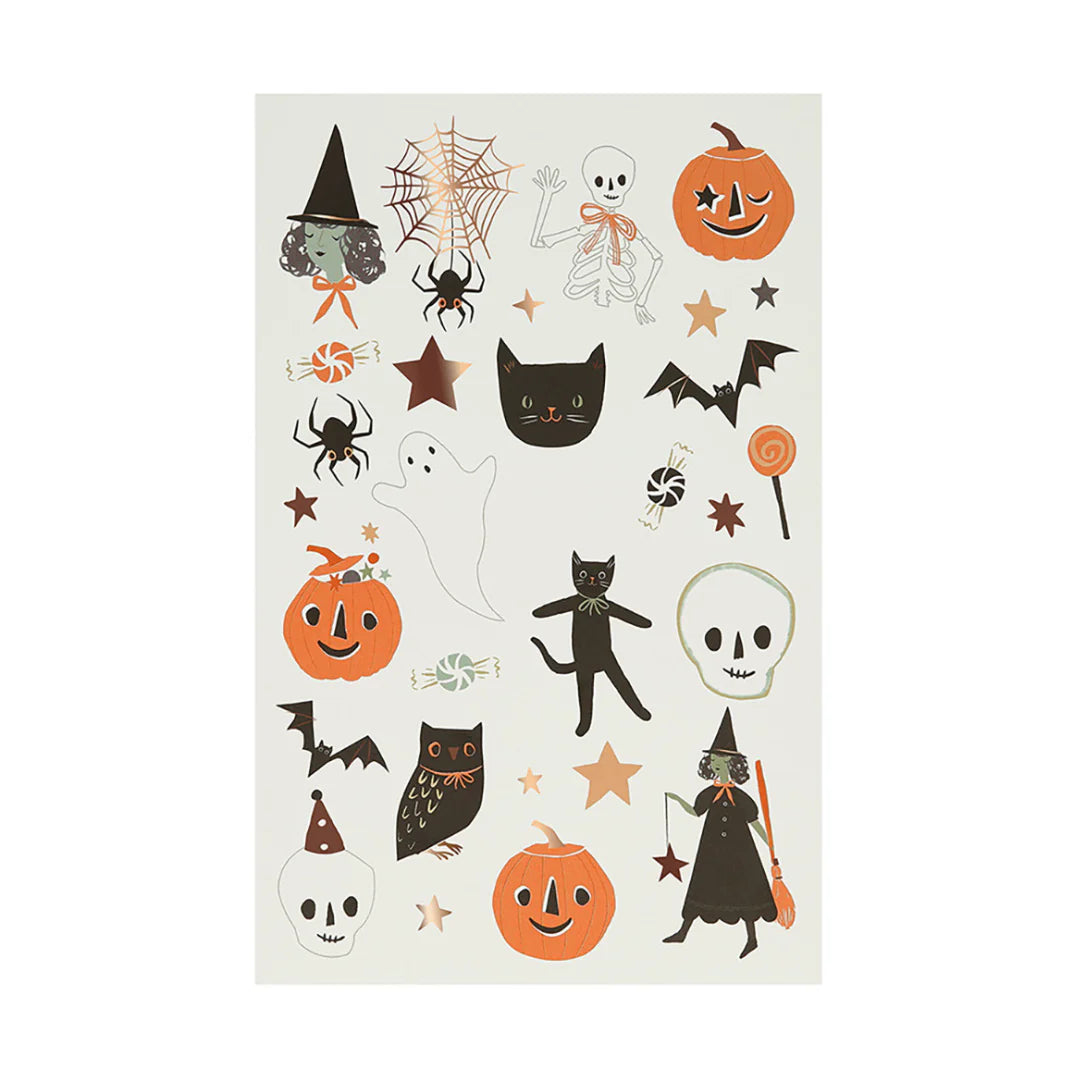 It's tattoo time! Kids will love to receive these halloween character tattoos with shimmering copper foil details. Ideal as a halloween party activity, party favors or pop them into party bags.