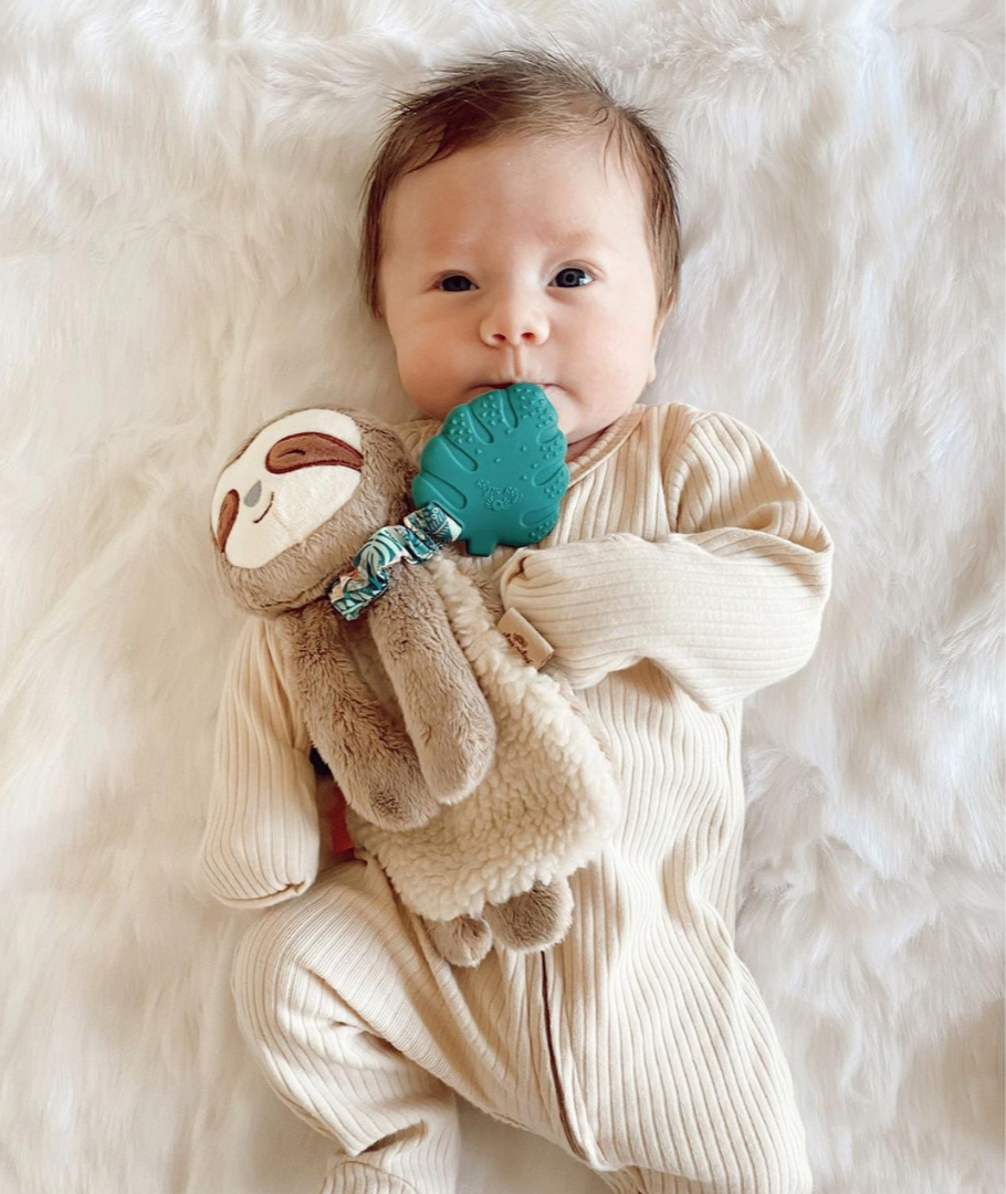 Our snuggly sloth lovey features soft sherpa fabric and textured ribbons that baby will love to explore!