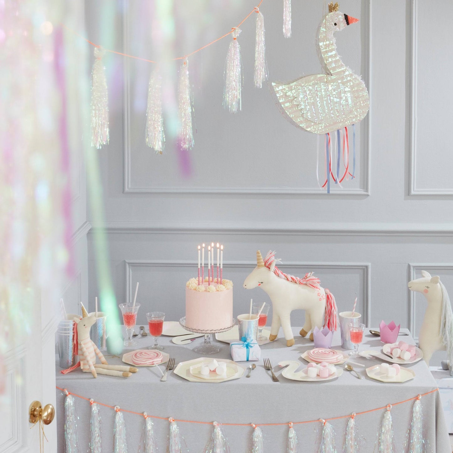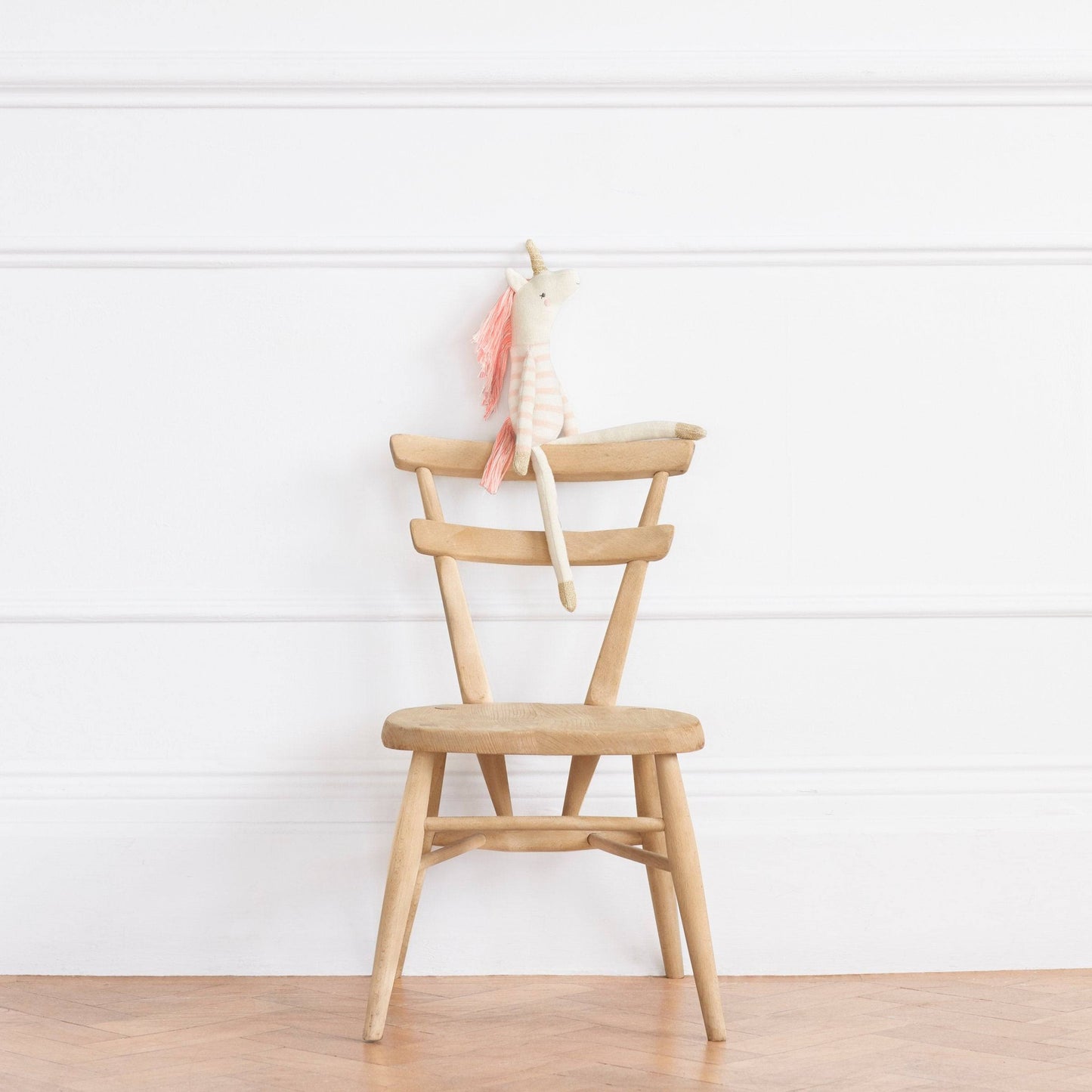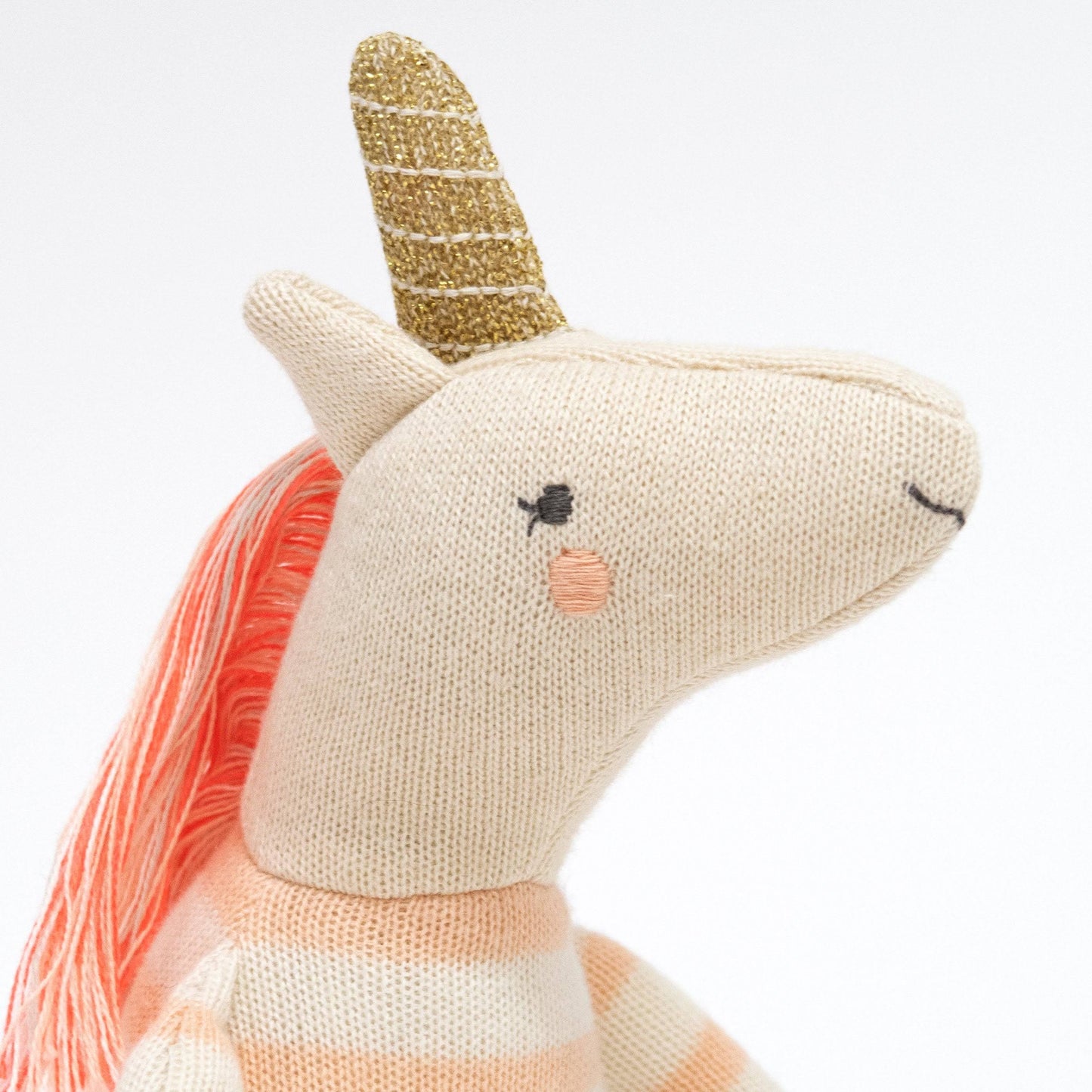 Izzy, a gorgeous unicorn toy, is made from soft organic knitted cotton. Little ones will love to cuddle and admire her colorful tasseled tail and mane. Features sweet embroidered features, a stripy top, and a sparkly gold horn.