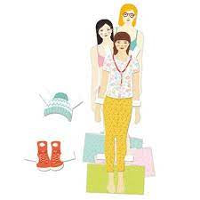 - Contents: 3 cardboard dolls (9" tall), over 10 pre-cut items of clothing and accessories (paper), 1 box with storage compartments.