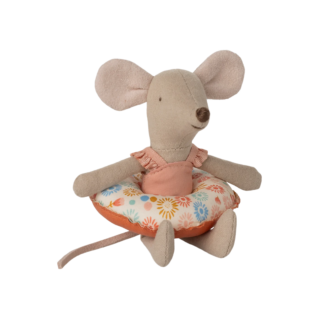 This summer set exist of a little sister mouse dressed in a rose colored swimsuit with her flower printed float around the stomach. She is now ready for a safe swim in sea.