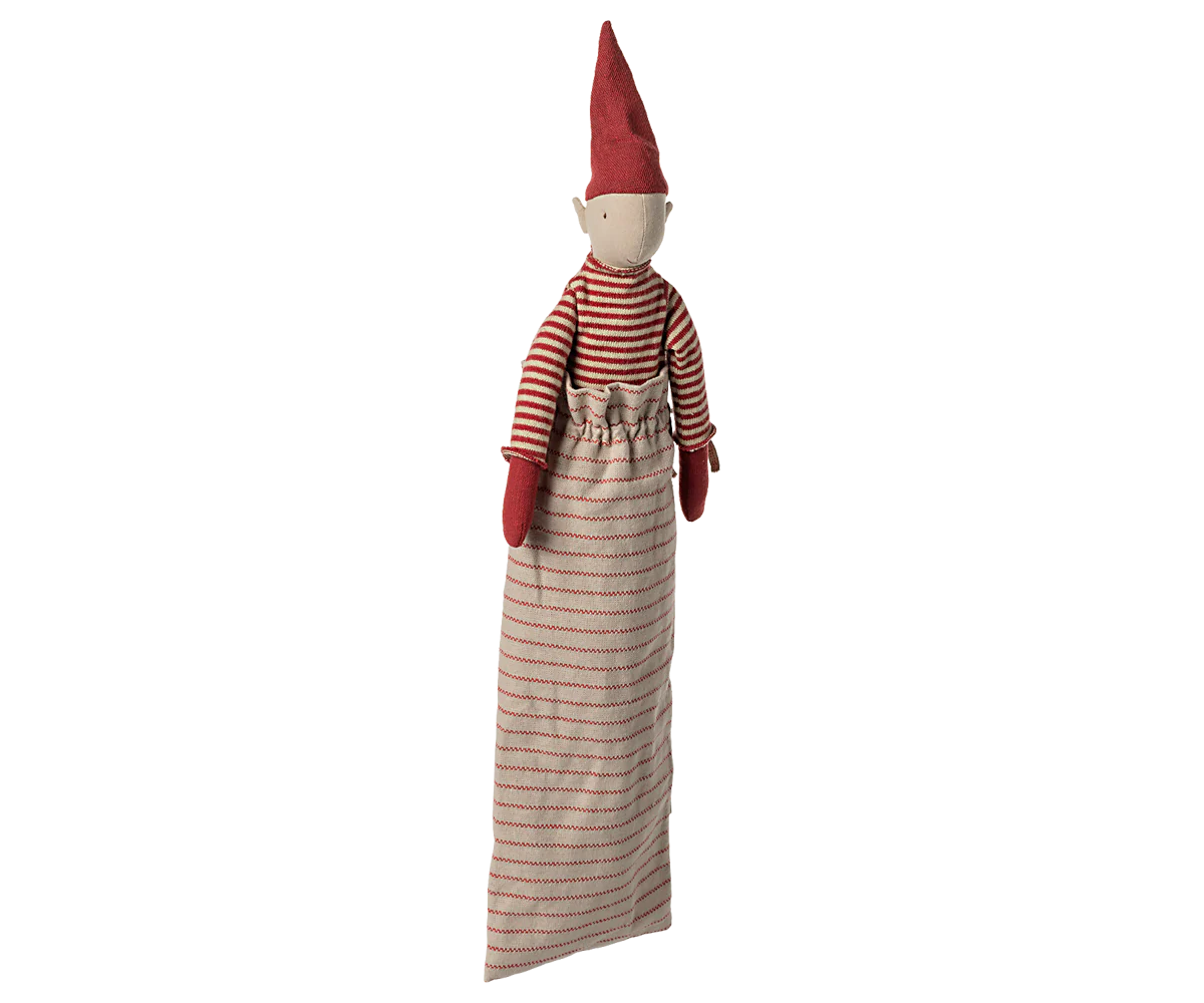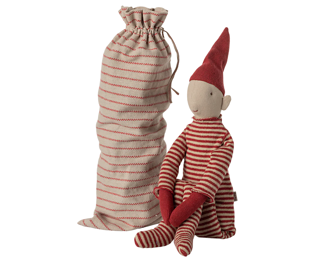 A long-legged pixy in a soft knitted suit with magnets in its hands so it can sit or hang wherever is suitable. It comes in soft fabric bag.