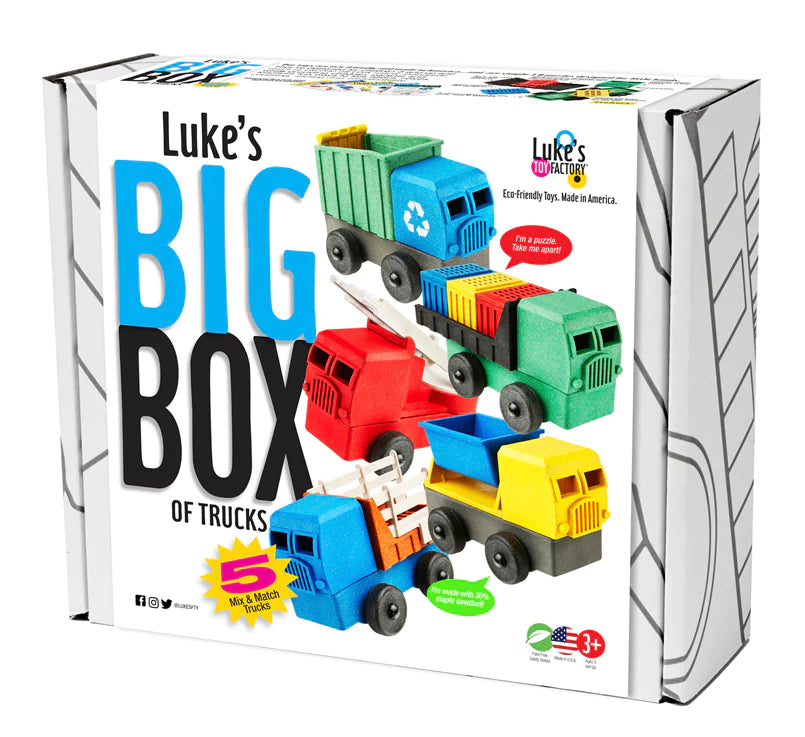 Preschools and grandparents know best. More trucks equals better learning and fun! Luke's Big Box of Trucks is a special collection of 5 trucks. You get the Recycling Truck, Fire Truck, Stake Truck, Tipper Truck and the Cargo Truck ( with all those little boxes :)