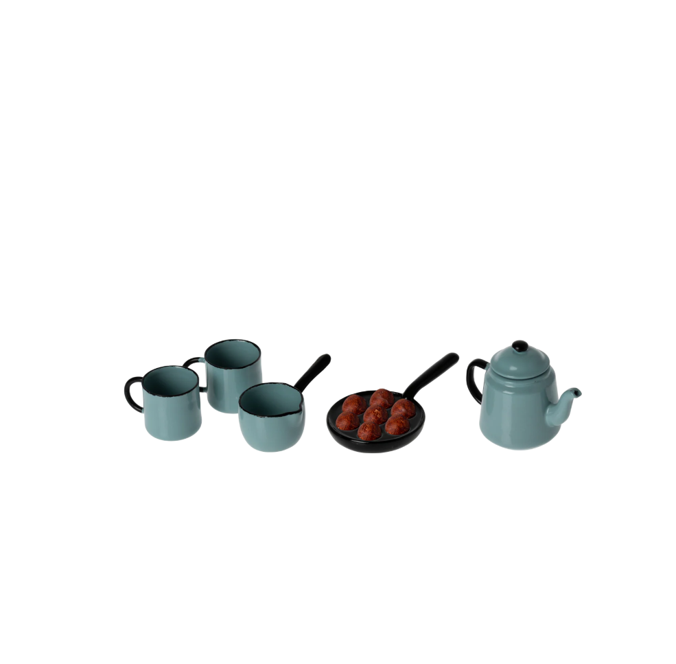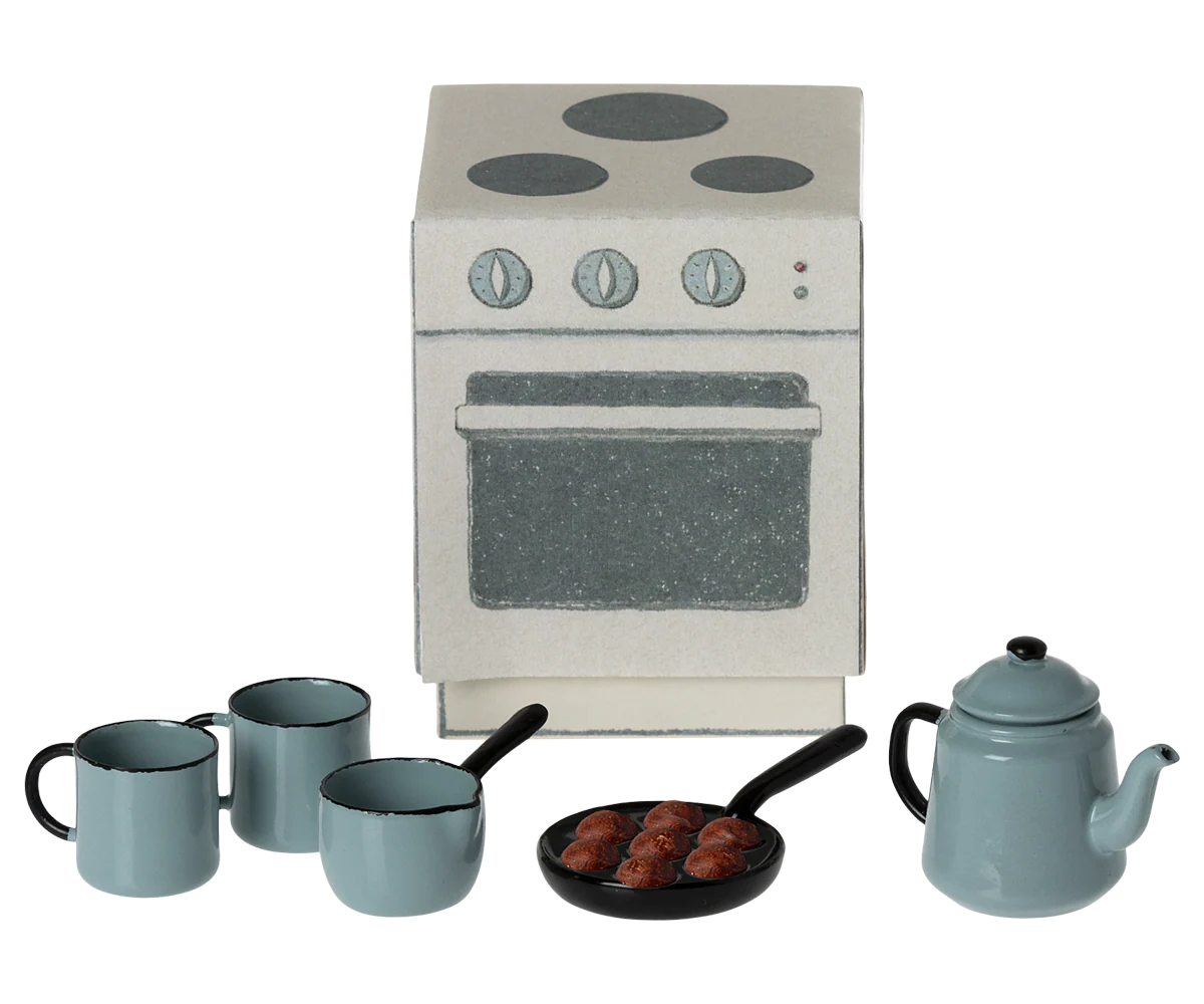 Our Madam Blue's Favorites set includes a sweet pot and two cups, a saucepan and a pan with delicious puff cakes - which are a traditional Scandinavian treat in the winter time. All these parts come in a sturdy paper box that looks like a stove and opens up. This set is the perfect size for our Mouse family.