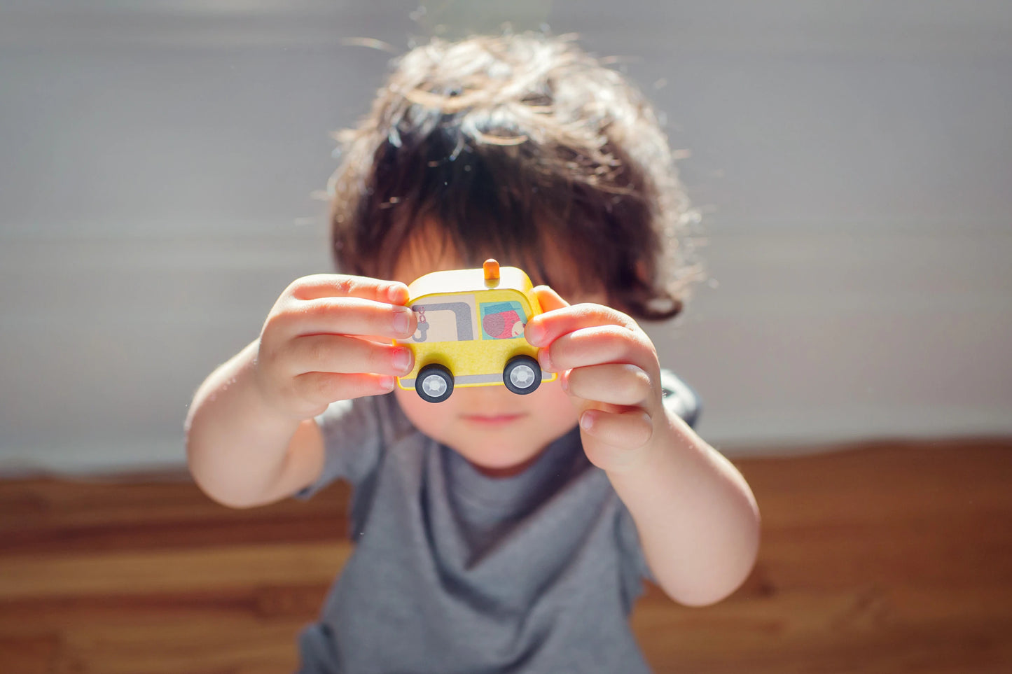 A wooden garage for very young children (18 months and up) to play with. Children can play with the three cars, pushing them down the ramp and hiding them under the garage or parking them. They can enjoy making them go and imitating the noise of the engine.