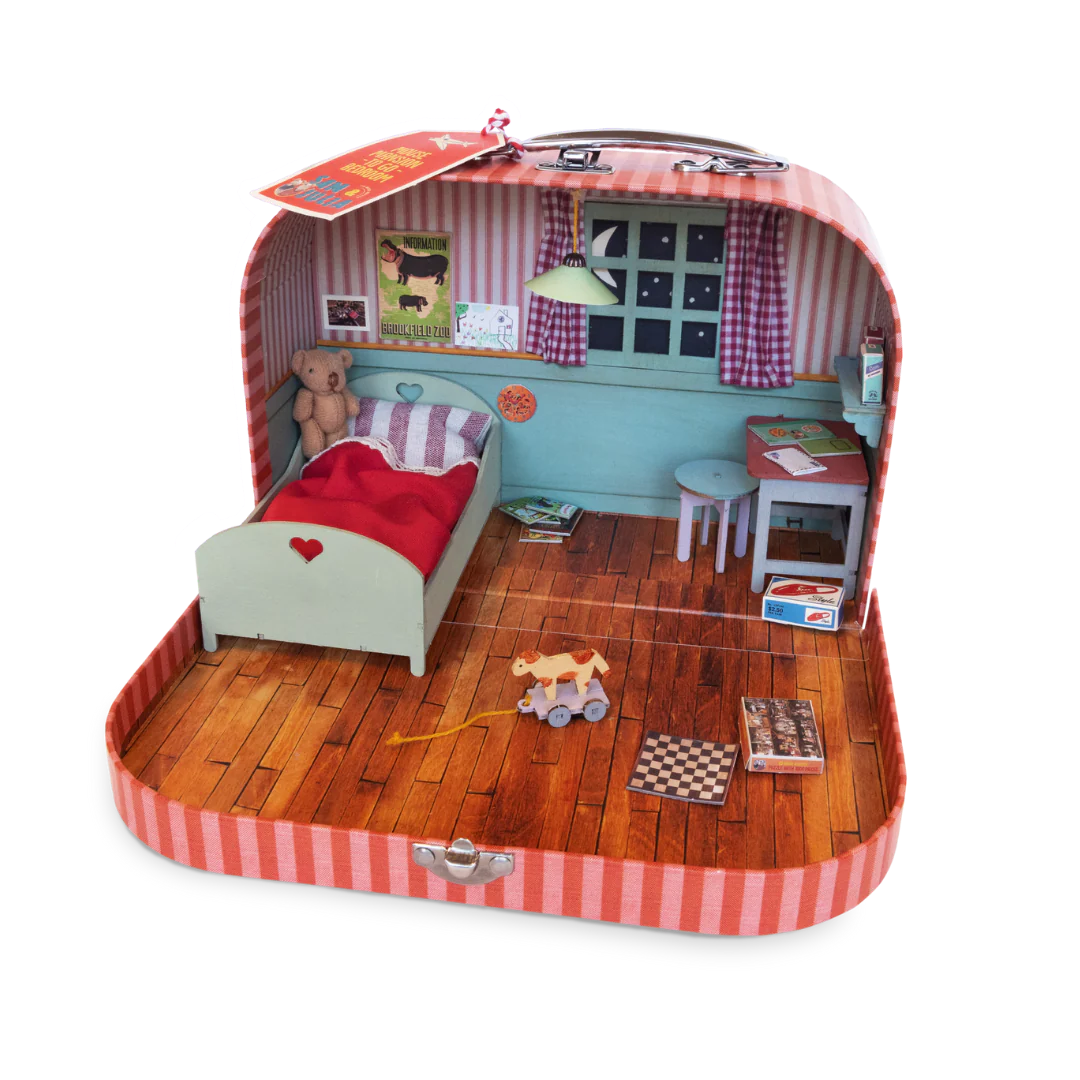 Take Sam and Julia everywhere you go in this fun little suitcase. Of course, you assemble this bedroom 'to go' yourself. This suitcase was designed by Karina Schaapman, the creator of the original Mouse Mansion.