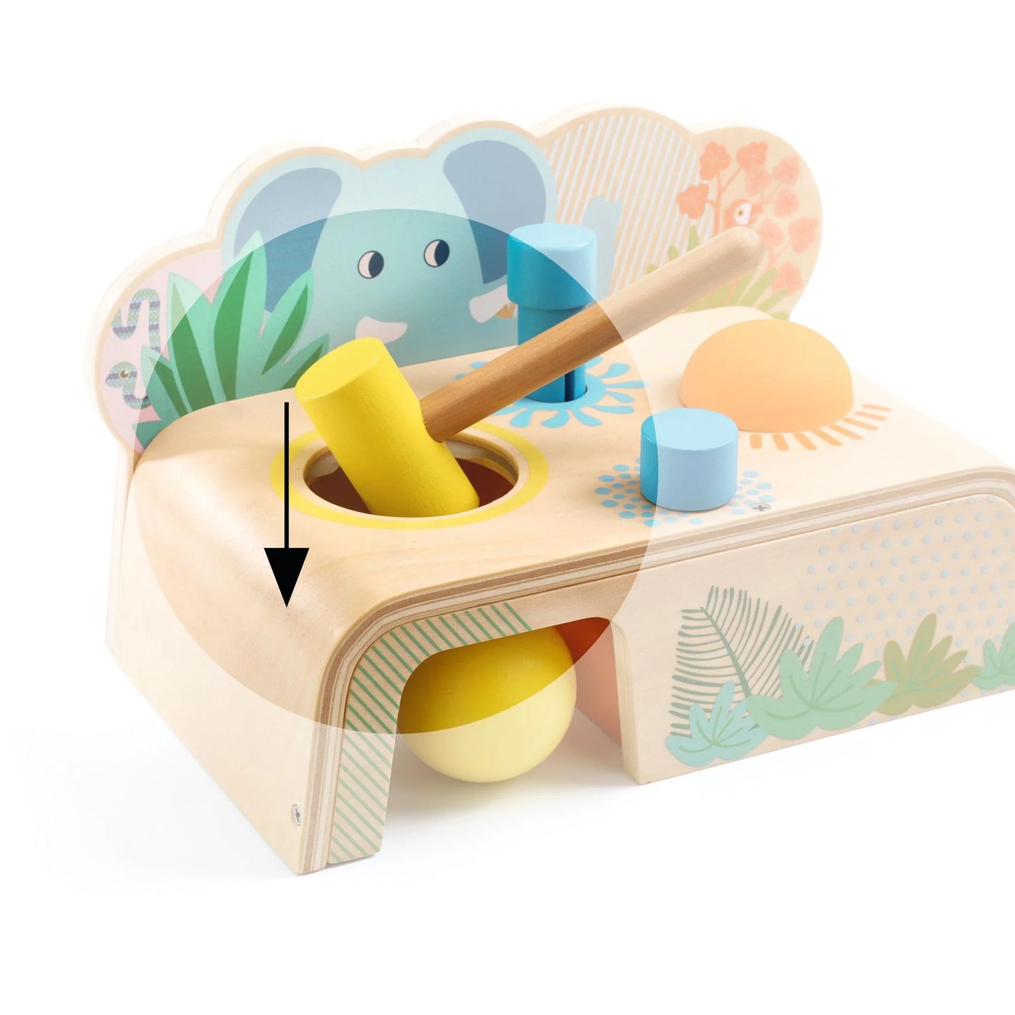 Contents: 1 wooden hammering toy with 4 pieces and 1 mallet.