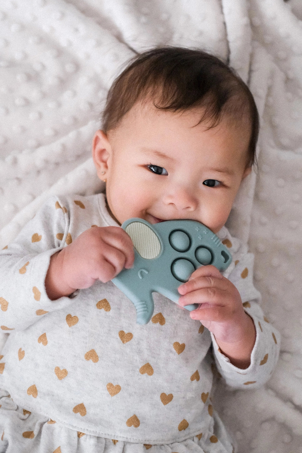 Chew on this! A pop of personality: a teething bestie & sensory toy all-in-one! Our Elephant Teether engages baby with popping sounds & movement while the raised textures gently soothe sore gums. Pop it in your bag or clip it for easy, fun, and safe relief while on-the-go.