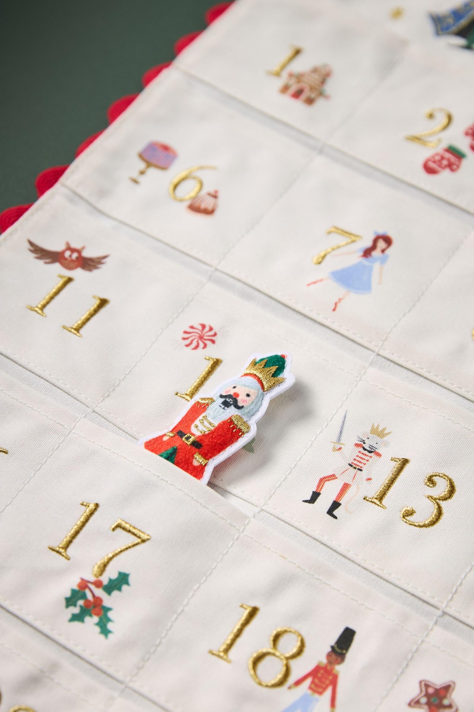 Countdown to Christmas with our fabric advent calendar, with embroidered designs and a felt Nutcracker figurine to move from day to day. The calendar hangs from a dowel with a gold cord for display.