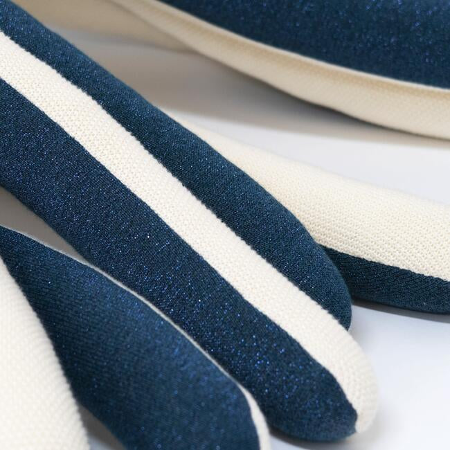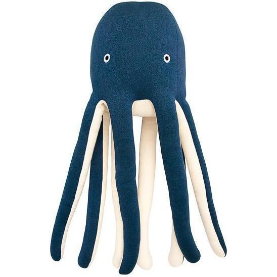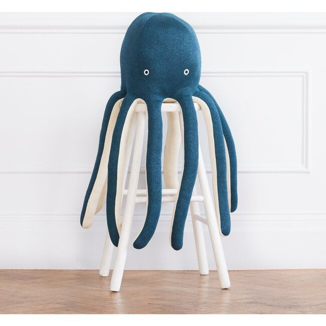 Cosmo octopus is a big and beautiful soft toy, expertly crafted from organic knitted cotton. The perfect gift for children who love sea creatures. They will love to play with his dangly arms and give him a cuddle. The top of his body and arms are a brilliant blue with a shimmering metallic thread, and the underside is a cream color.