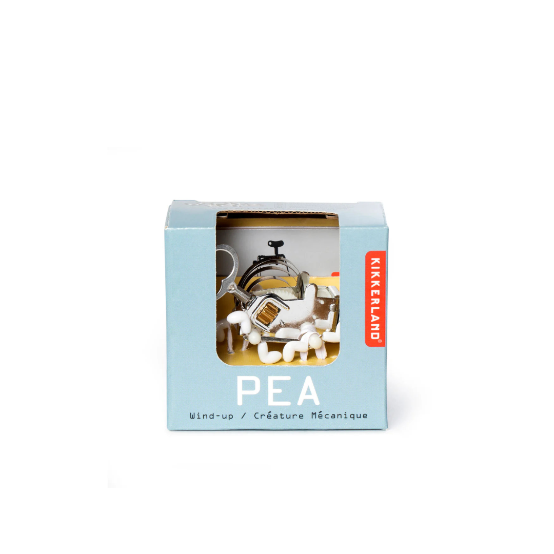 PEA is a tiny new member of Kikkerland’s Critter family. Although PEA is rather compact, it behaves in a superlative manner, performing acts and maneuvers never previously observed in our winding universe. PEA not only overcomes small obstacles, but also, when it finds tough barriers, it often rolls over and lands on its feet to cruise away in a new direction. Another interesting feature is that PEA can be gently rolled like dice on a table, and it frequently tumbles back onto its feet to begin a new adventure. Although PEA marches like a tough guy, it is small and delicate; therefore it should be treated gently