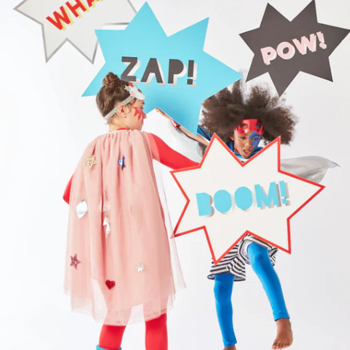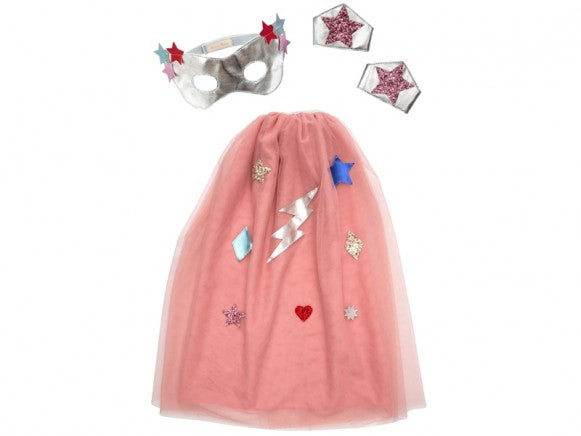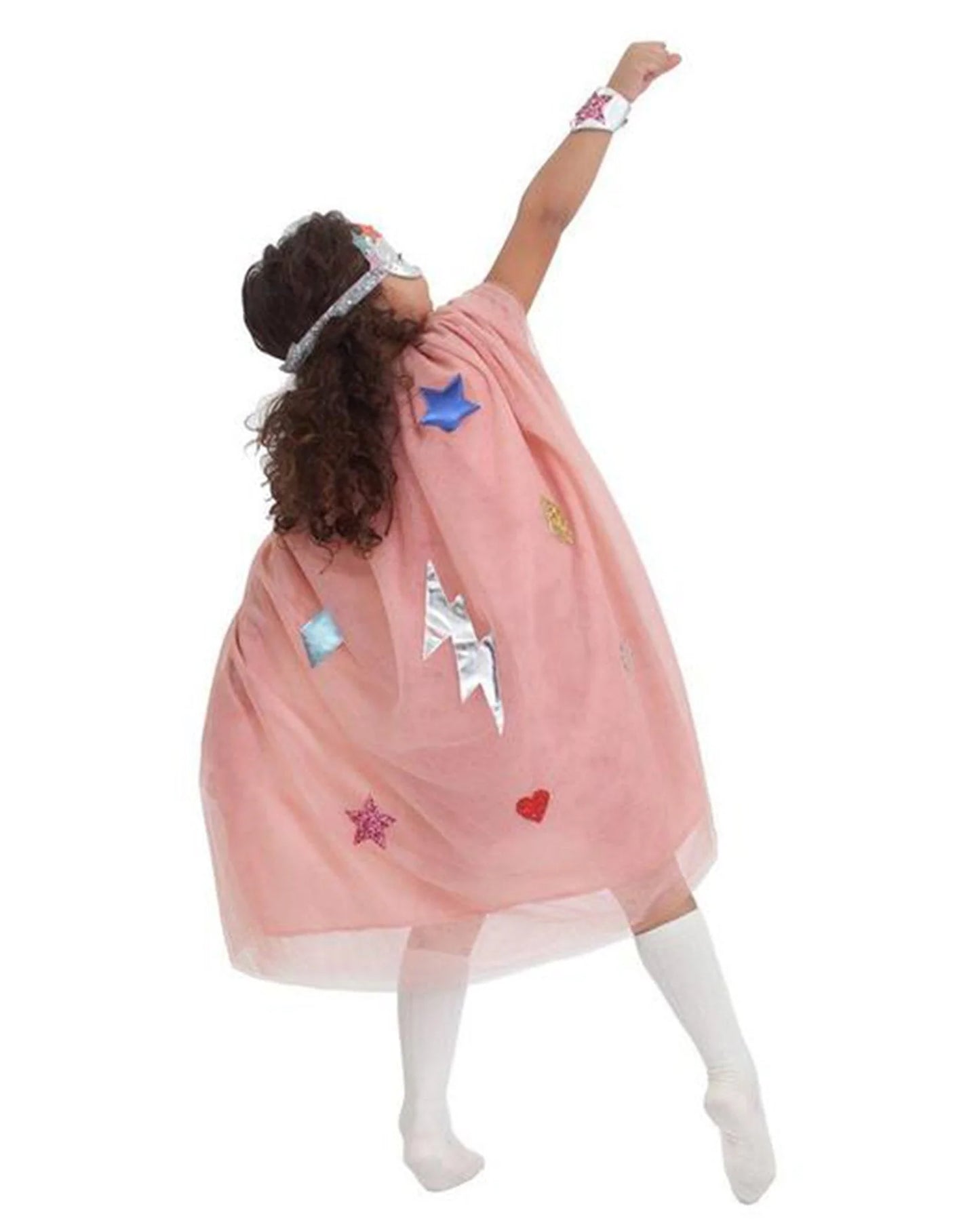 Little ones love to pretend they have superpowers, so help them play the part with this brilliant pink superhero dress-up kit. Featuring a tulle cape and leatherette mask and wrist cuffs, all beautifully embellished with bright stars and glitter.