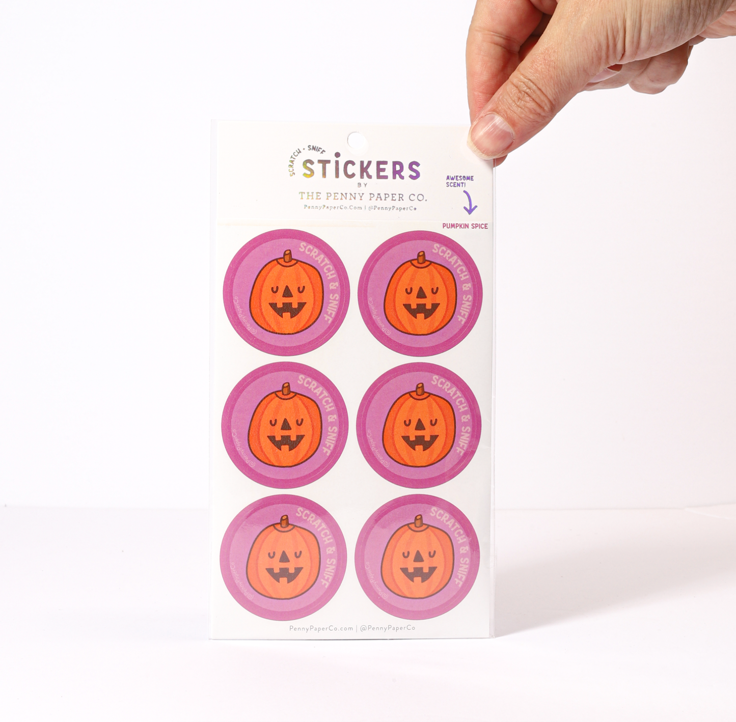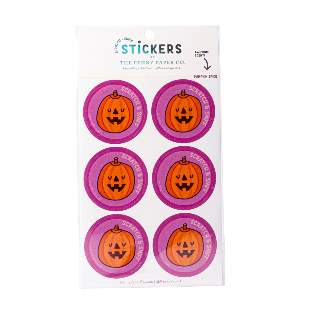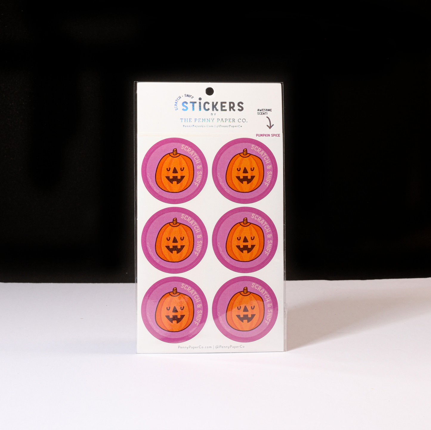 A super-fun, retro-style, round scratch and sniff sticker sheet!