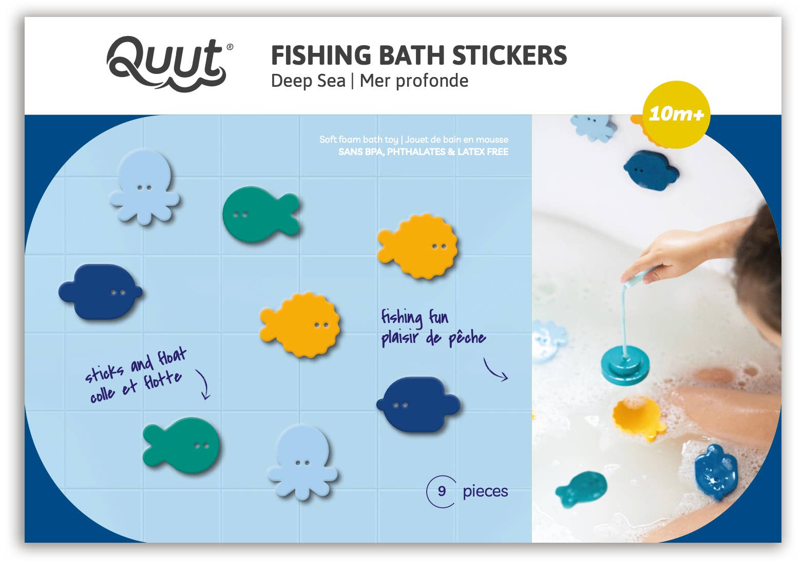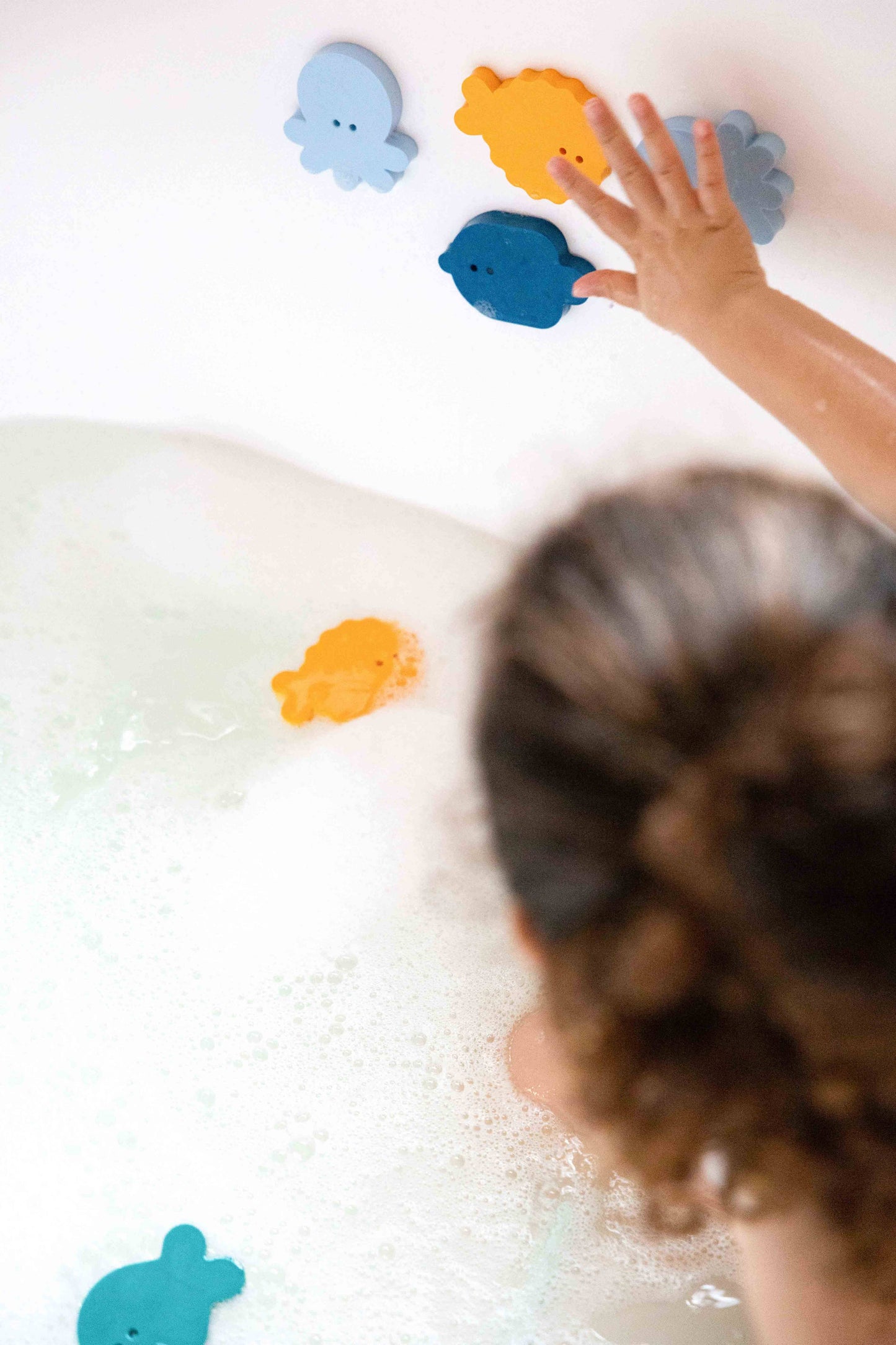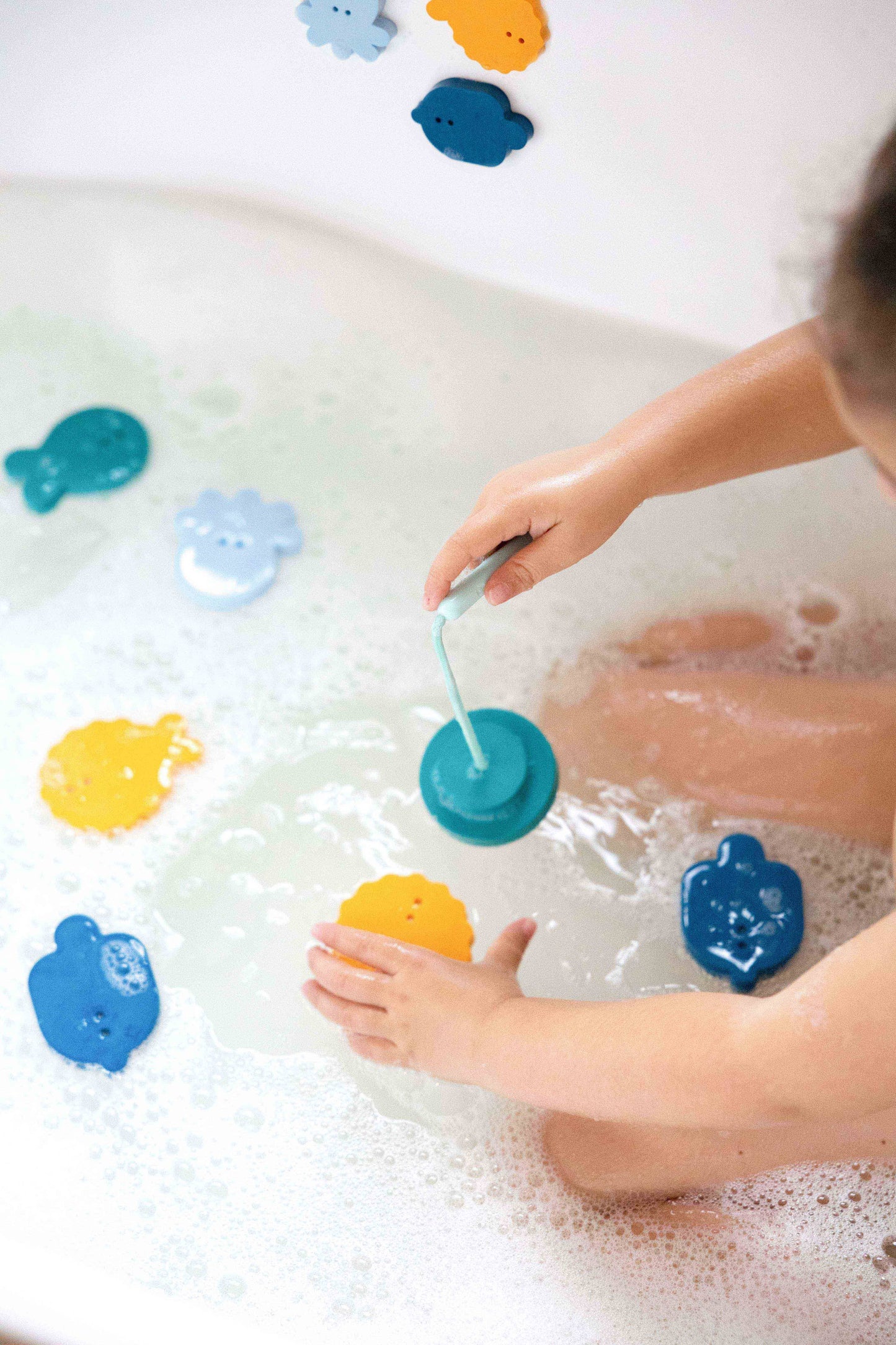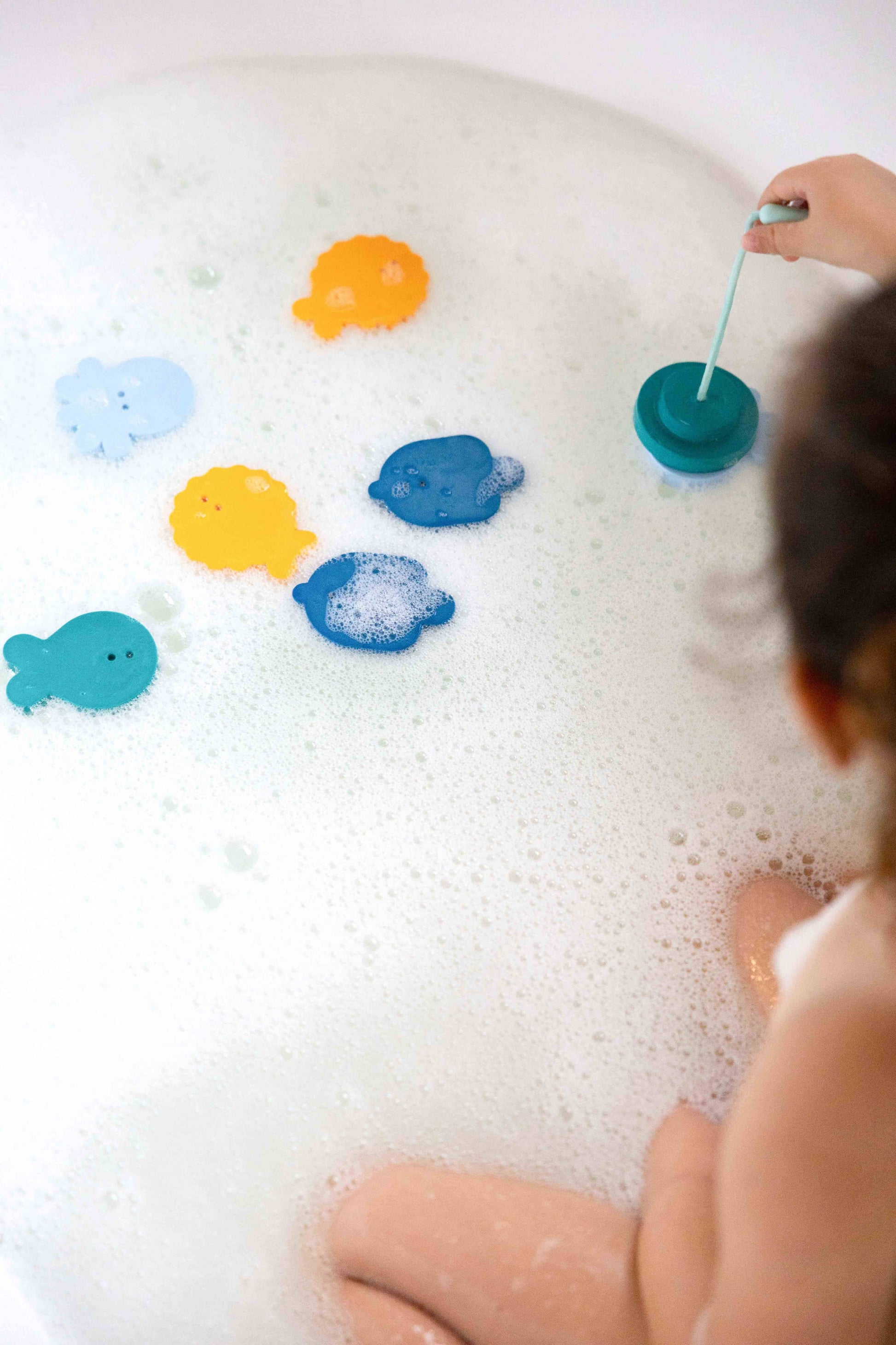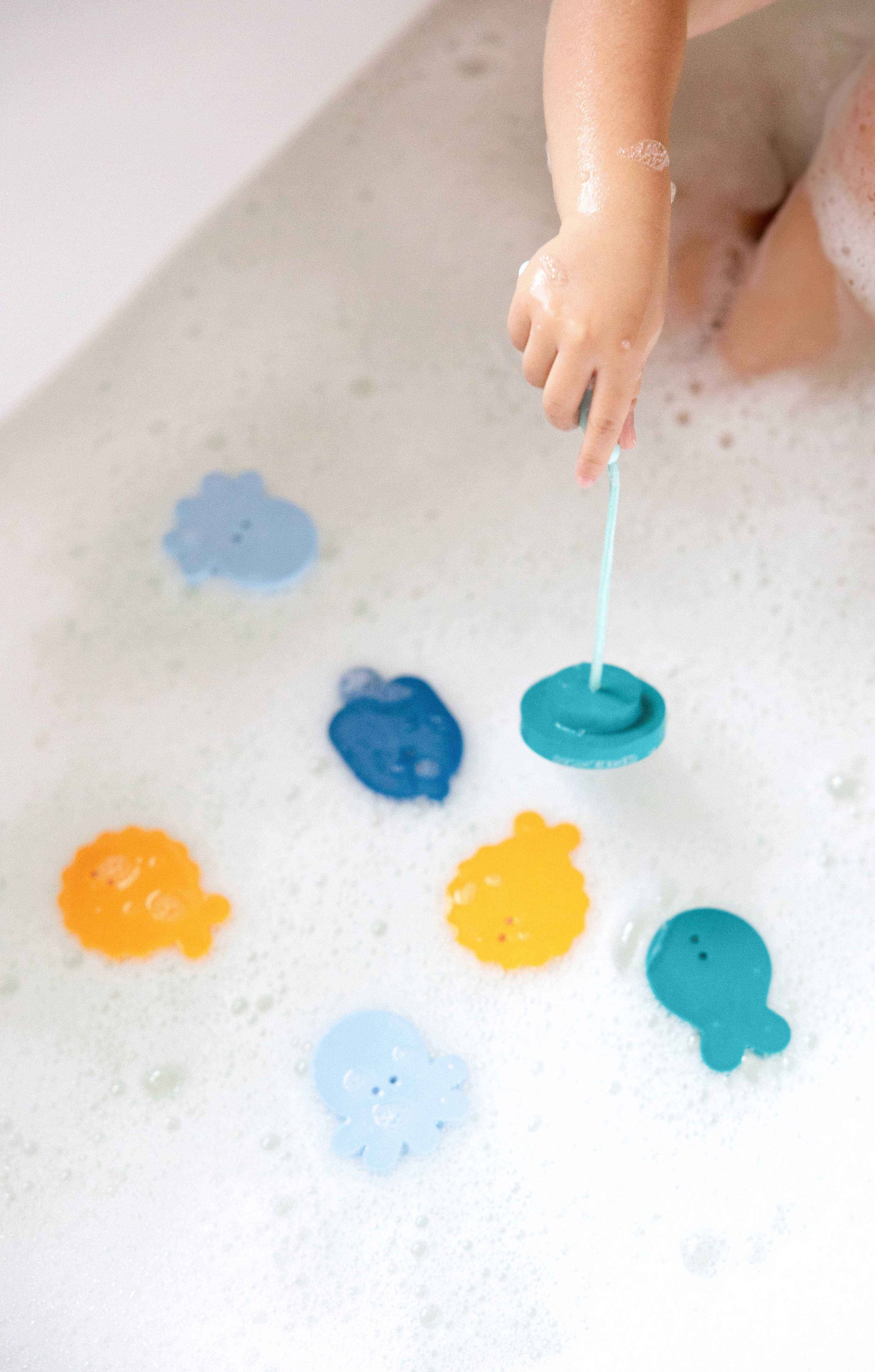 From 10 months, kids play with floating foam blocks that stick to tub walls. At 18 months, they fish with the included rod—no magnets needed!