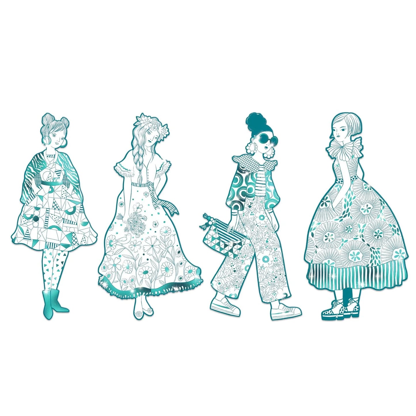 A parade of girls wearing colorful outfits for you to color in however you'd like! Four large outlines offer outfits covered in patterns and adorned with metallic areas to make the models look even better!