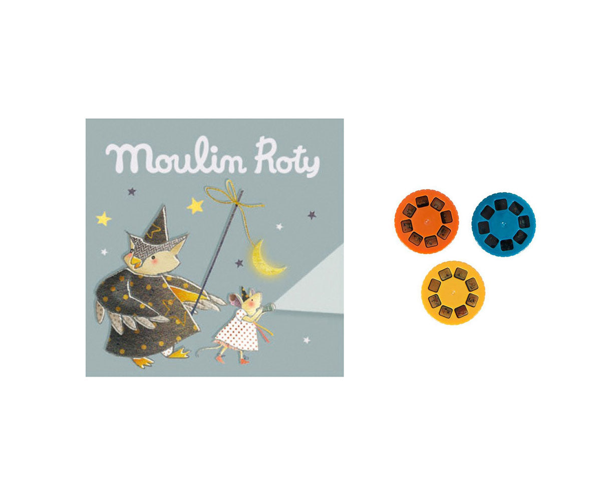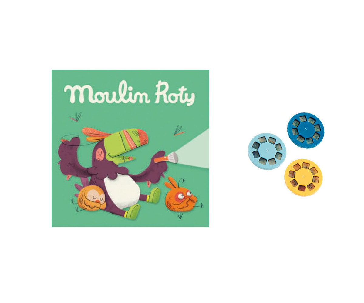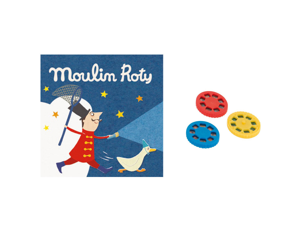 Moulin Roty Storybook Torches encourage the fine art of story-telling. Simply insert a colorful story disc into the flashlight, dim the lights and shine the projected image onto a flat surface. These add-on story disc sets make the perfect companion to our Storybook Torches.