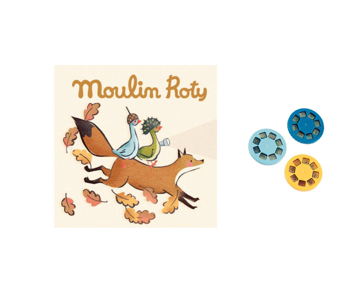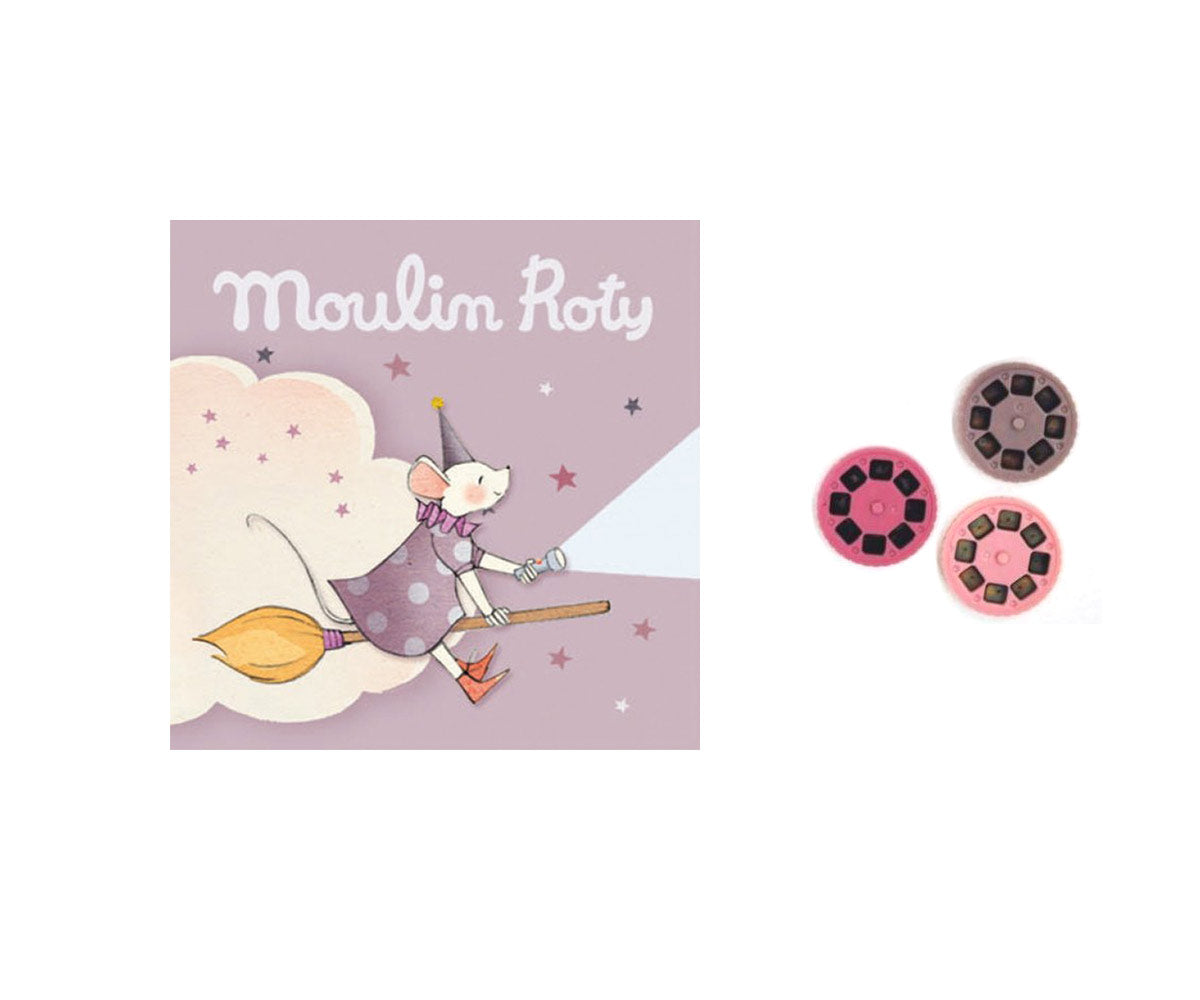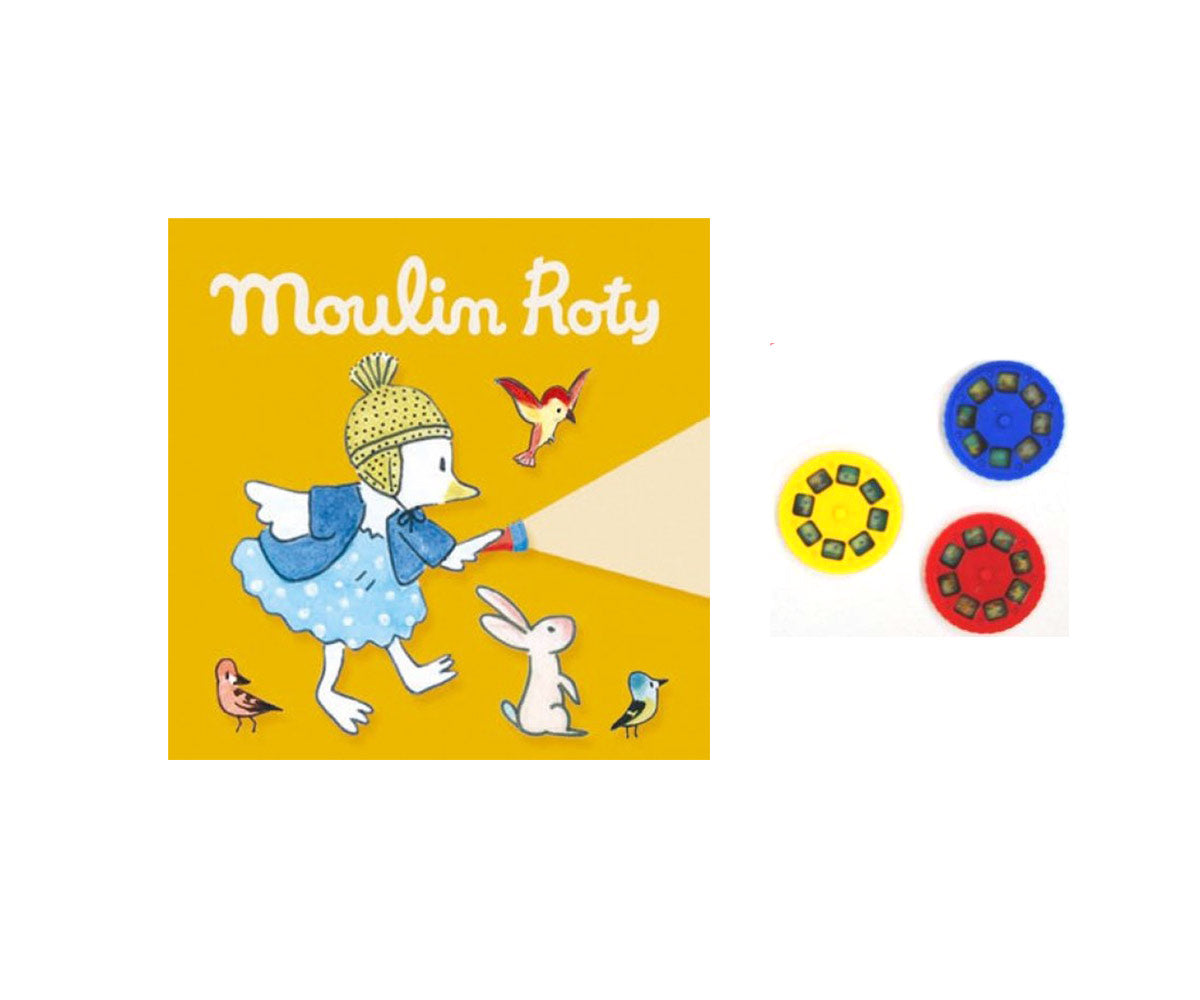 Moulin Roty Storybook Torches encourage the fine art of story-telling. Simply insert a colorful story disc into the flashlight, dim the lights and shine the projected image onto a flat surface. These add-on story disc sets make the perfect companion to our Storybook Torches.